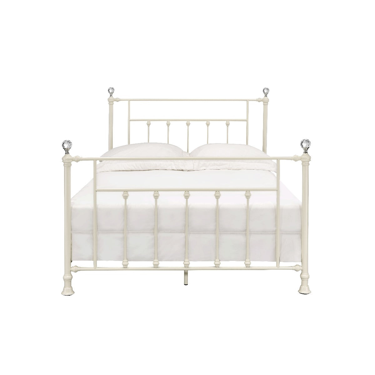 With a versatile design that could pairs beautifully with farmhouse, vintage, and rustic styles. With graceful details such as crystal-like accents on the bedposts and slatted headboard and footboard. This Comet bed is not only visually striking it is also sturdy. The white finish complements existing decor and color schemes.