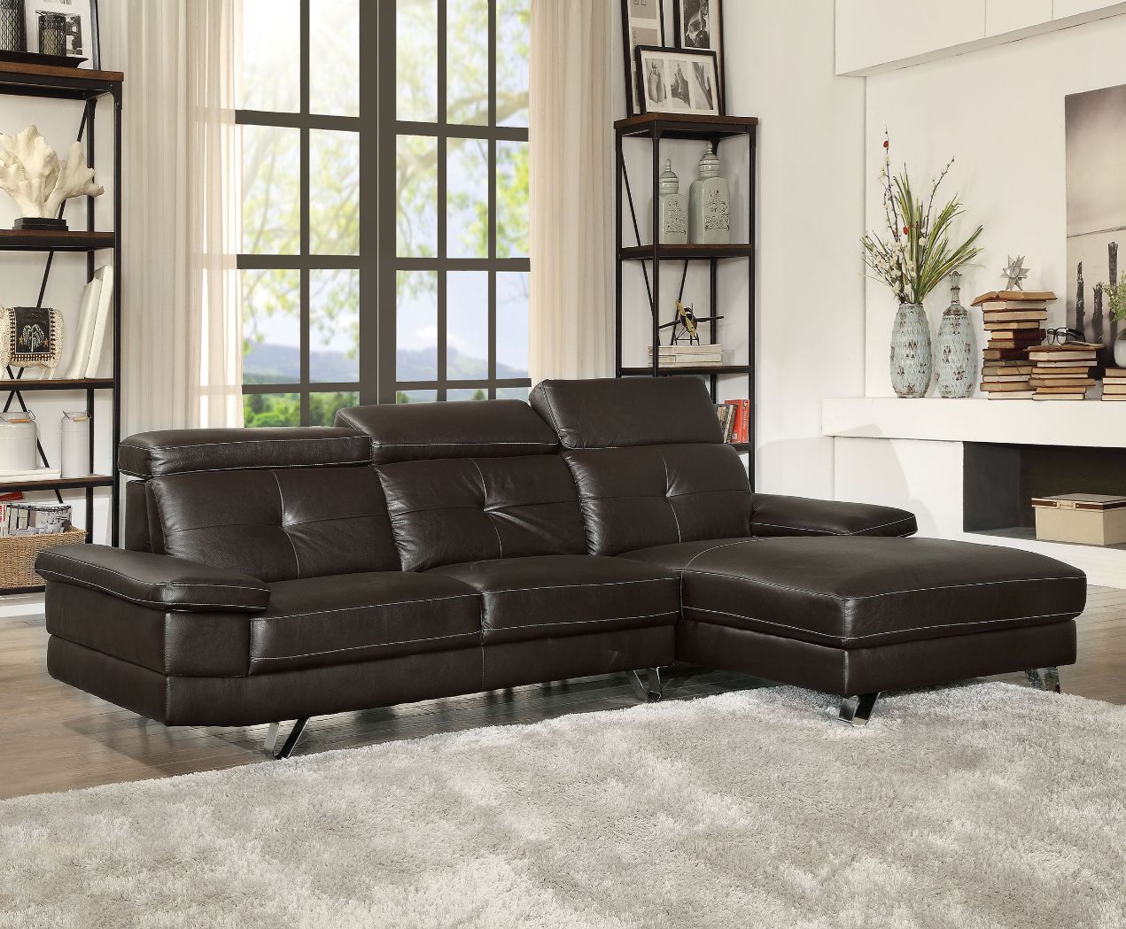 KD, Sectional Sofa (Adjustable Headrest, Buttonless Tufted Backrest) "L" Shape Sectional: LF Sofa & RF Chaise (Not Reversible/No Pillows) Tight Back & Loose Seat Cushion Seat Construction: Pocket Coil & Full Foam Filling Armrest: Pillow Top Metal "V" Shape Leg: Chrome Finish (KD) (No Matching Ottoman) Material: Espresso PU (Solid Pattern)