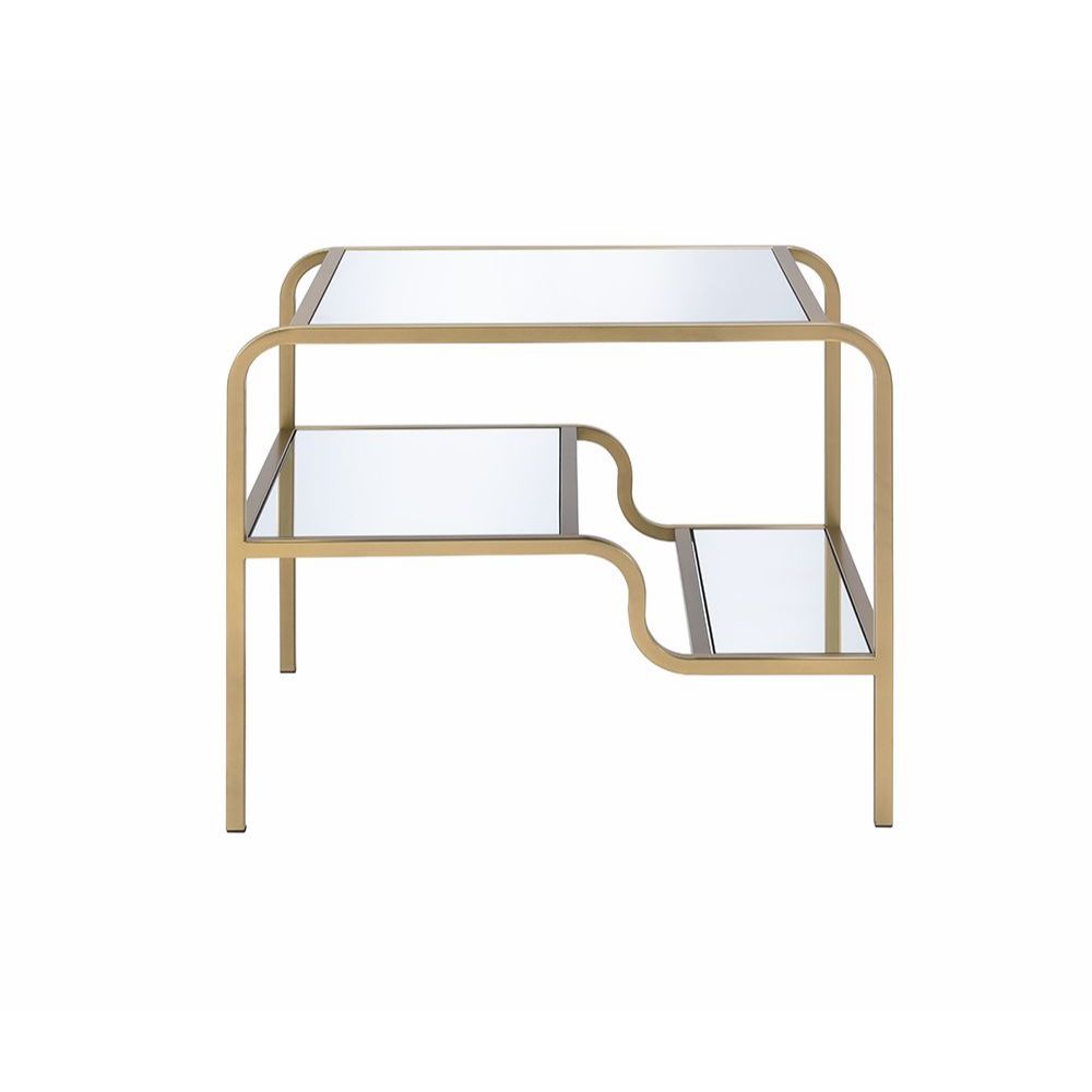 Center your seating arrangement around a sleek and sophisticated style with the Astrid occasional collection. Inspired by timeless materials, it features a mirror top with a stylish curving frame made of refined gold metal coating. An open base and floating shelf gives the piece an airy feel, but never sacrifices functionality.