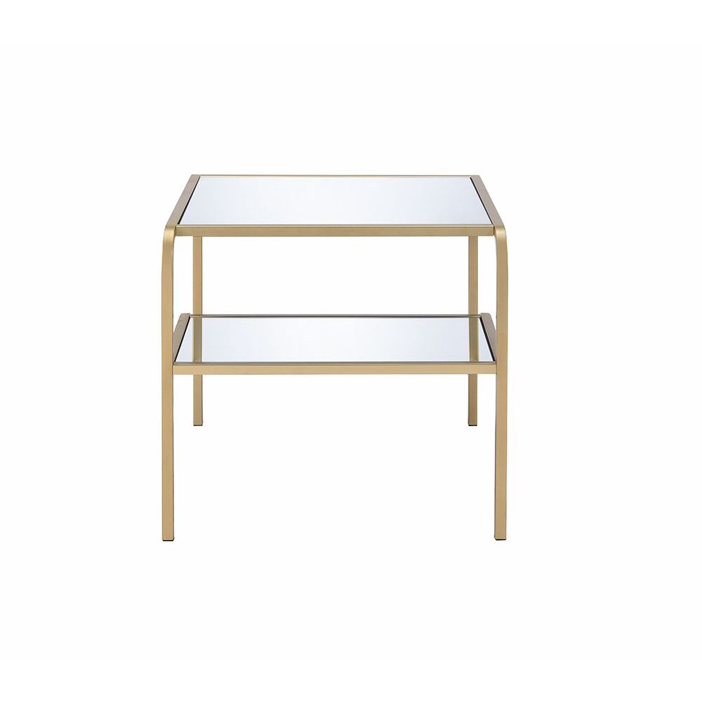 KD, Rectangular End Table Storage: 2 Open Compartment (2 Mirrored Shelves) CONSTRUCTION Mirrored Top: 3mm Mirror (NOT Beveled), Back w/5mm Ply in Black Finish (NO Apron) Metal Leg (Etagere Frame): Gold Finish, Square Metal Tube w/Liquid Coat Q&A] Shelves Size: Top 23" x 24", Mid 15" x 24", Base 8" x 24" Clearance between Shelves: 9" & 15" Clearance between Floor & Shelves: 7" & 13"