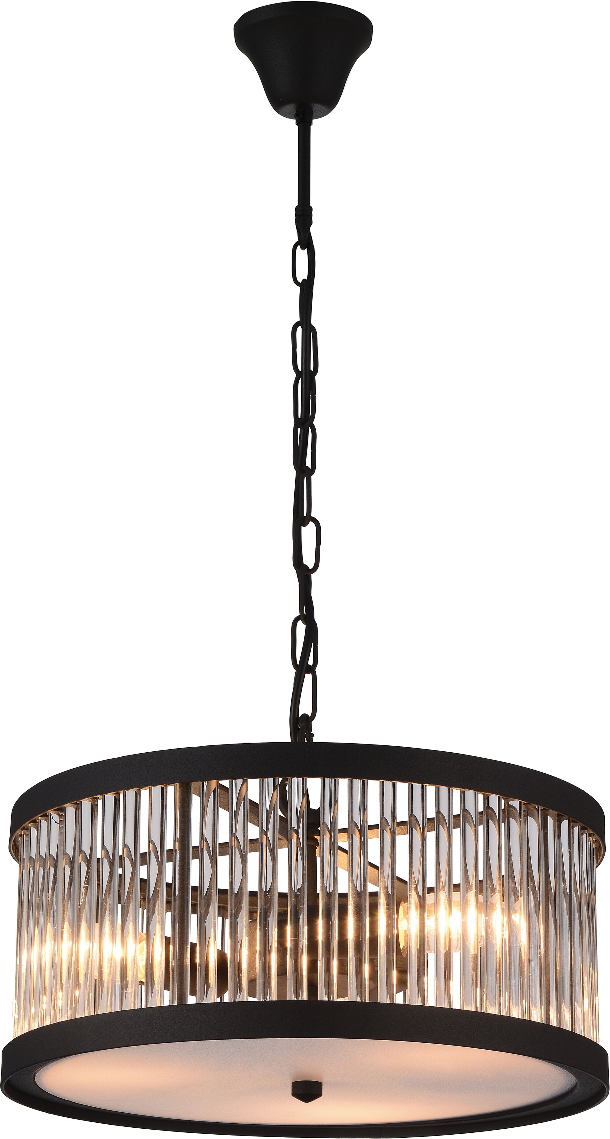 Pendant Lamp Drum Shape, Clear Glass: 14"Dia x 6 x 1 (355 x 160 x 25mm), Crystal Tube: 6"H x 10mm, Shade "X" Metal Support: 12" (315mm x 20mm x 2mm) Light Bulb NOT Included Light Bulb required: E14, # Max 3 x 40W Hardware Included (Slope Ceiling Not Recommended) Frame Material: Metal, Iron Chain length: 43"H (1090mm)