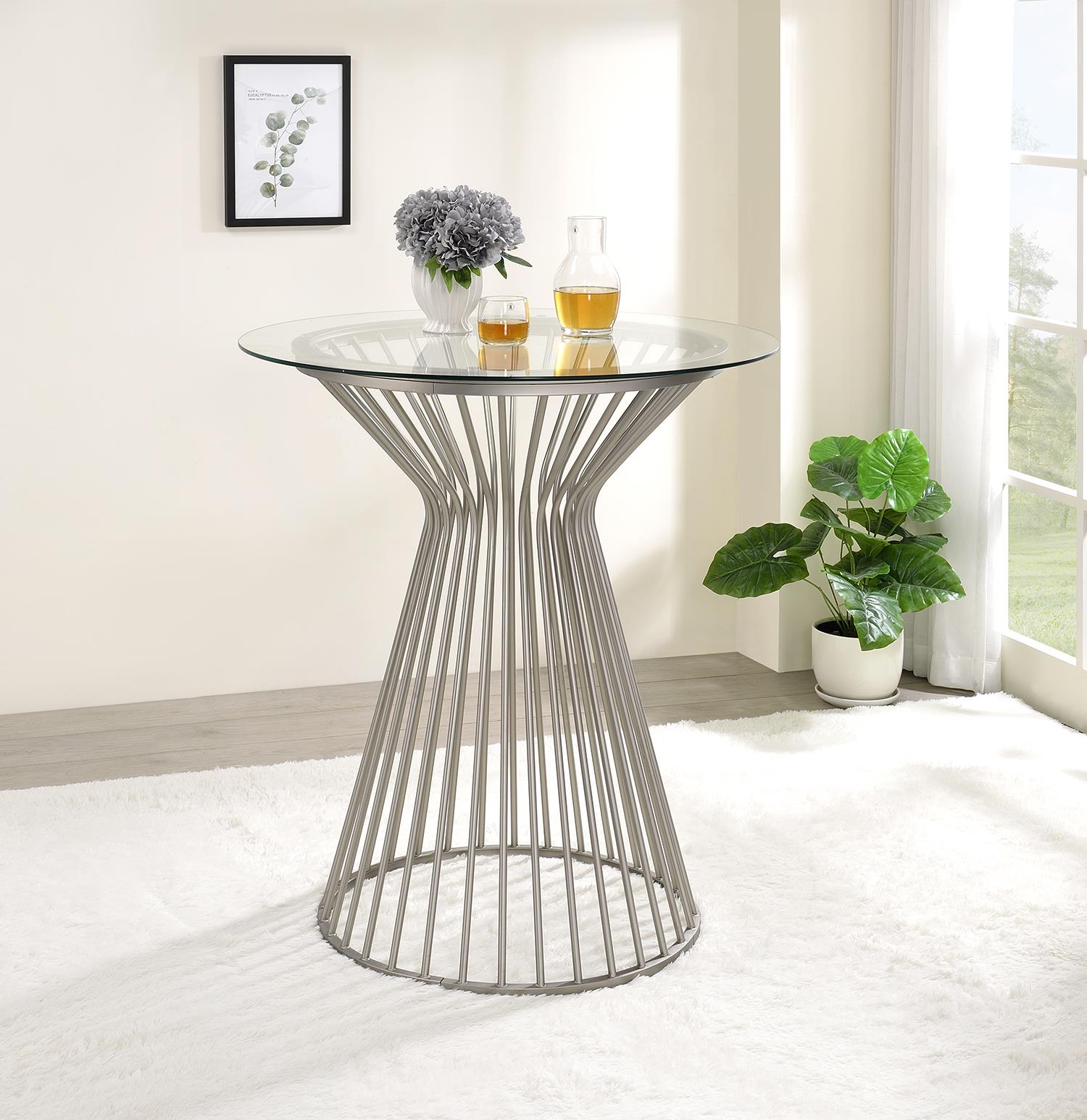 Perfect for a modern entertainment room or the corner of a dining room, this bar table offers an ideal pub height for standing and chatting with a cocktail or glass of wine. Tall and stately, it catches the eye with its hourglass-inspired round frame made of heavy gauge steel. The frame also features a finish that offers a subtle shine. On top of the base is a round clear tempered glass tabletop. Place this bar table in your home for entertaining.