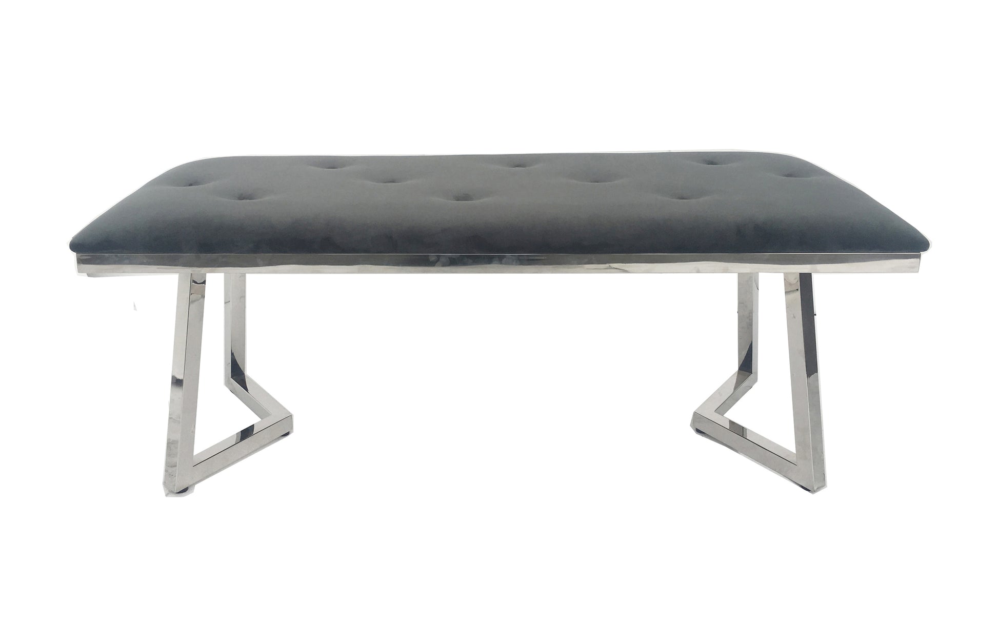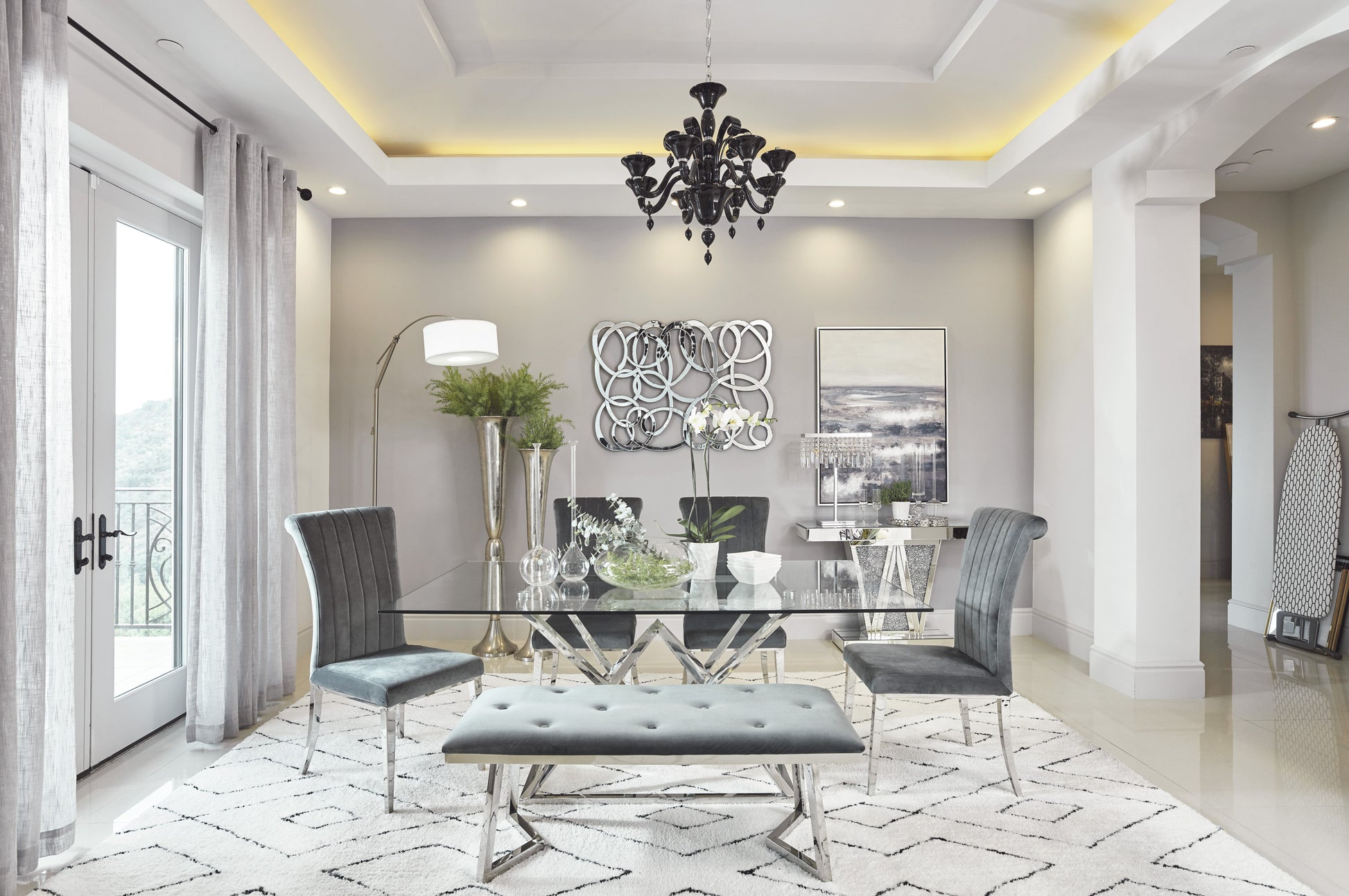 * Sleek dark grey velvet upholstered chair and bench to complete the dining room look
