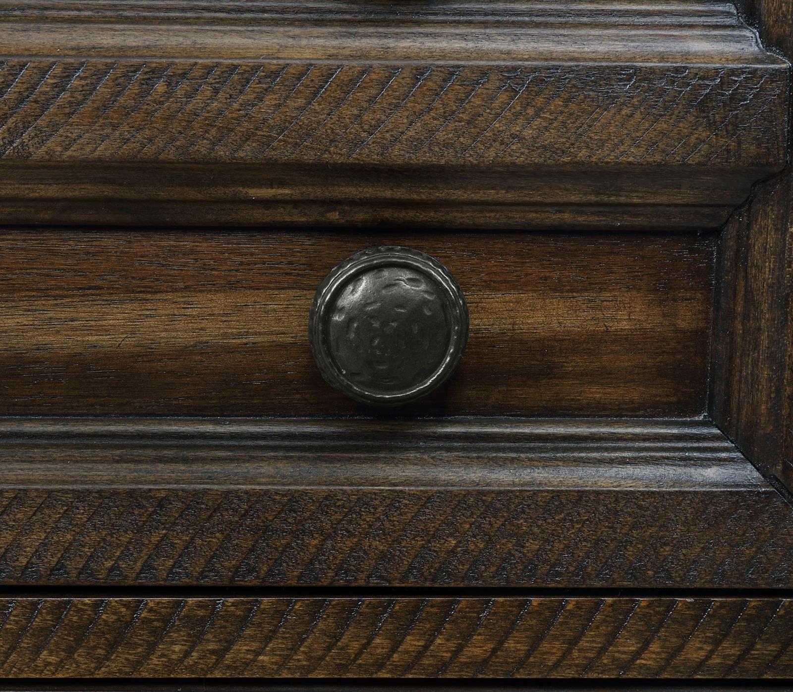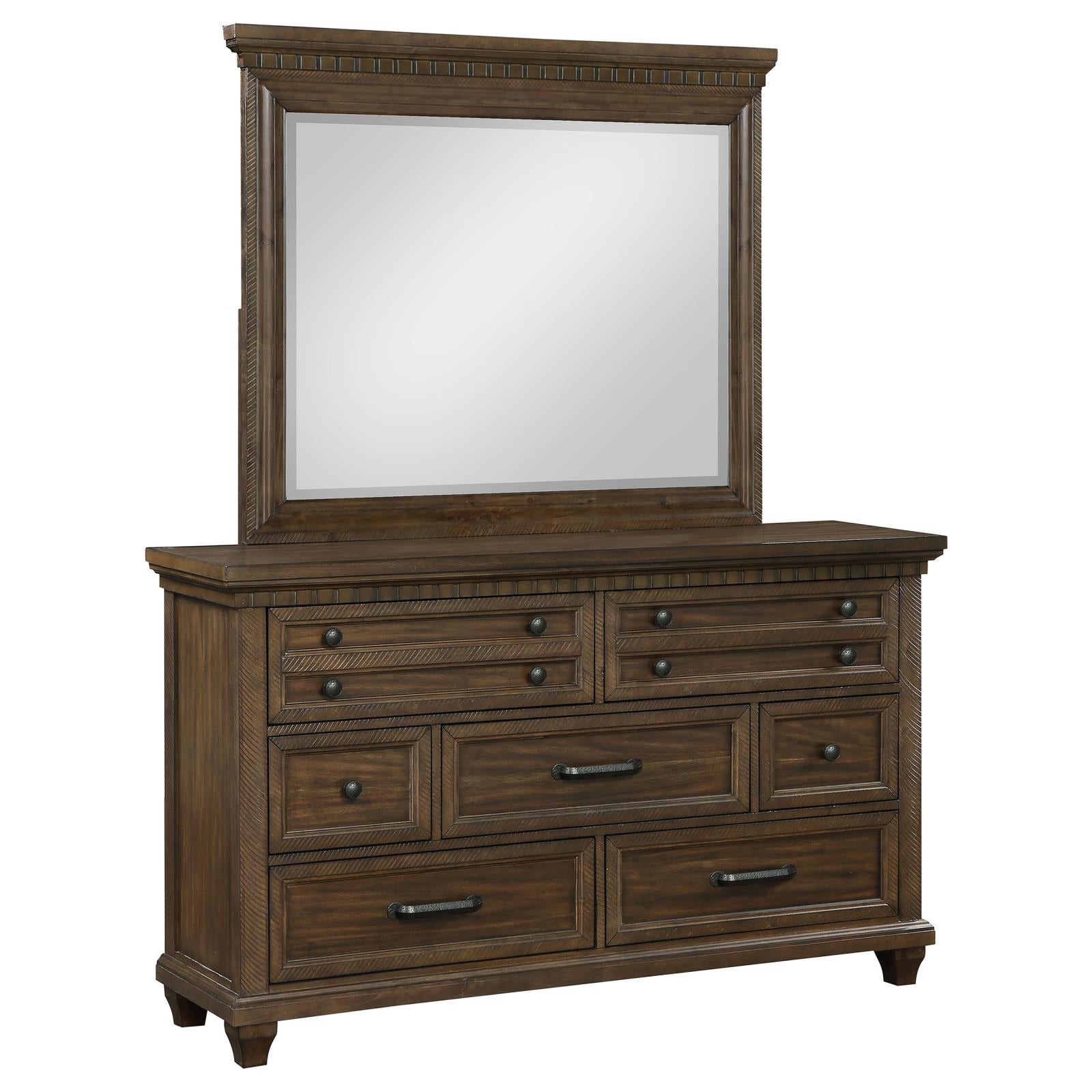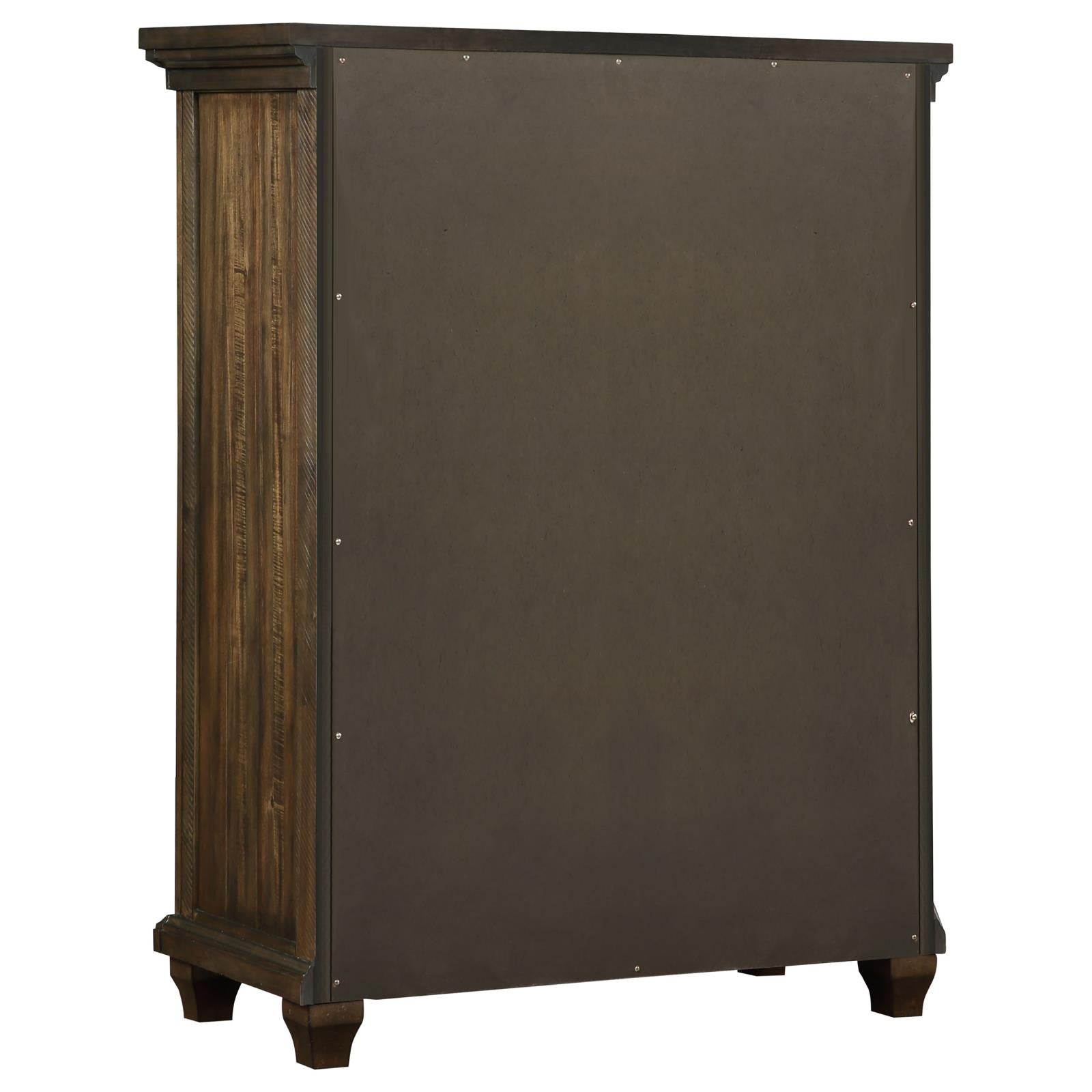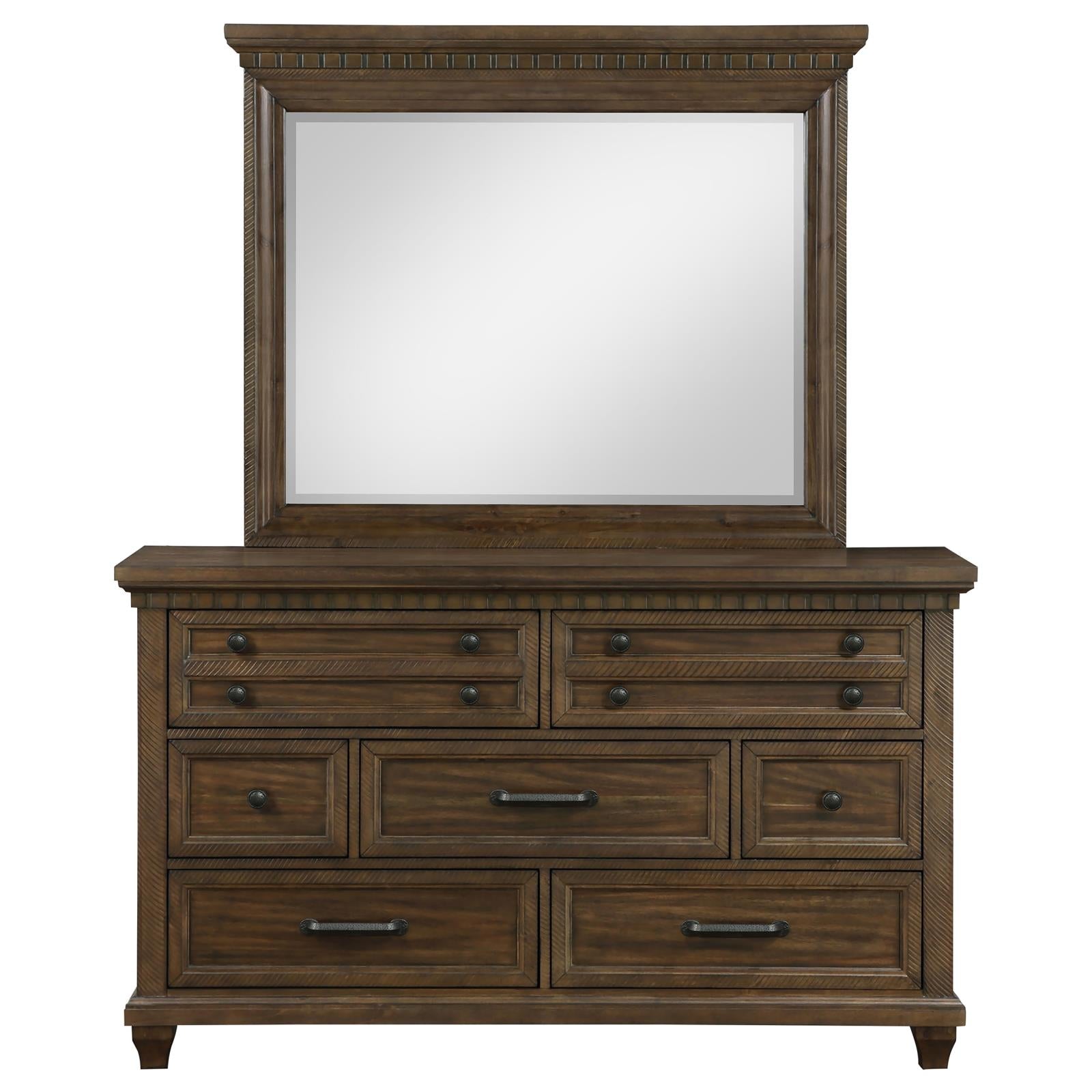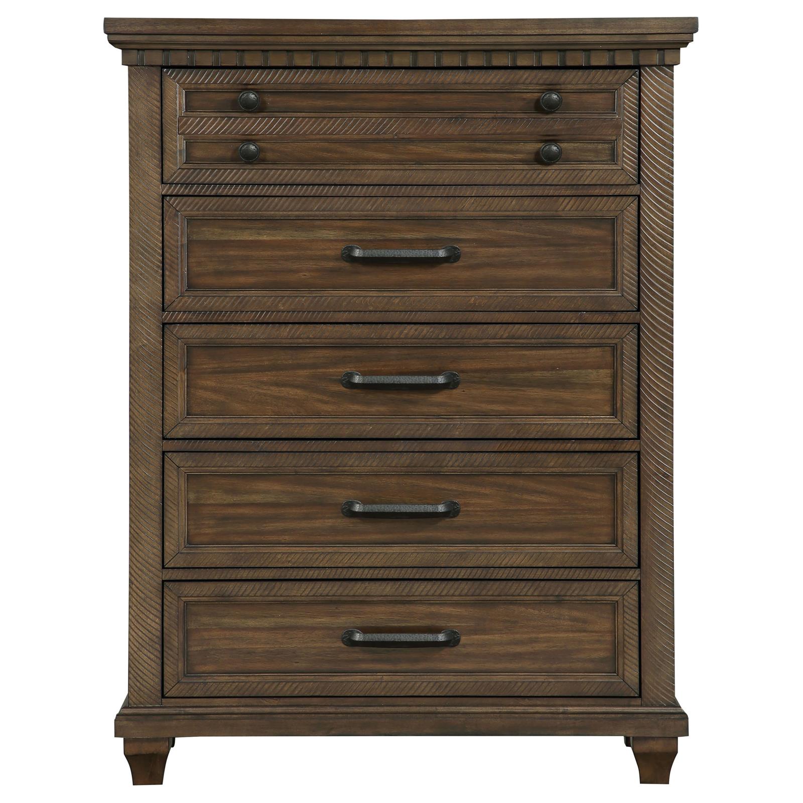 A classic traditional farmhouse motif is touched up with a hint of vintage, turning this five-piece bedroom set into a prominent collection for completing homey master or guest suites. Fashioned of wood and wood products, each piece offers extras including felt-lined drawers and USB ports built-in to the nightstand. The majestic bed and case pieces feature an Acacia wood stain with natural woodgrain and gorgeous designs, contributing to a well-appointed boudoir. A wood bed with a tall headboard joins accent pieces in featuring ornate molding and complementary hardware, along with proportional silhouetting. Set includes one bed, one nightstand, one chest, one dresser, and one rectangular framed mirror.