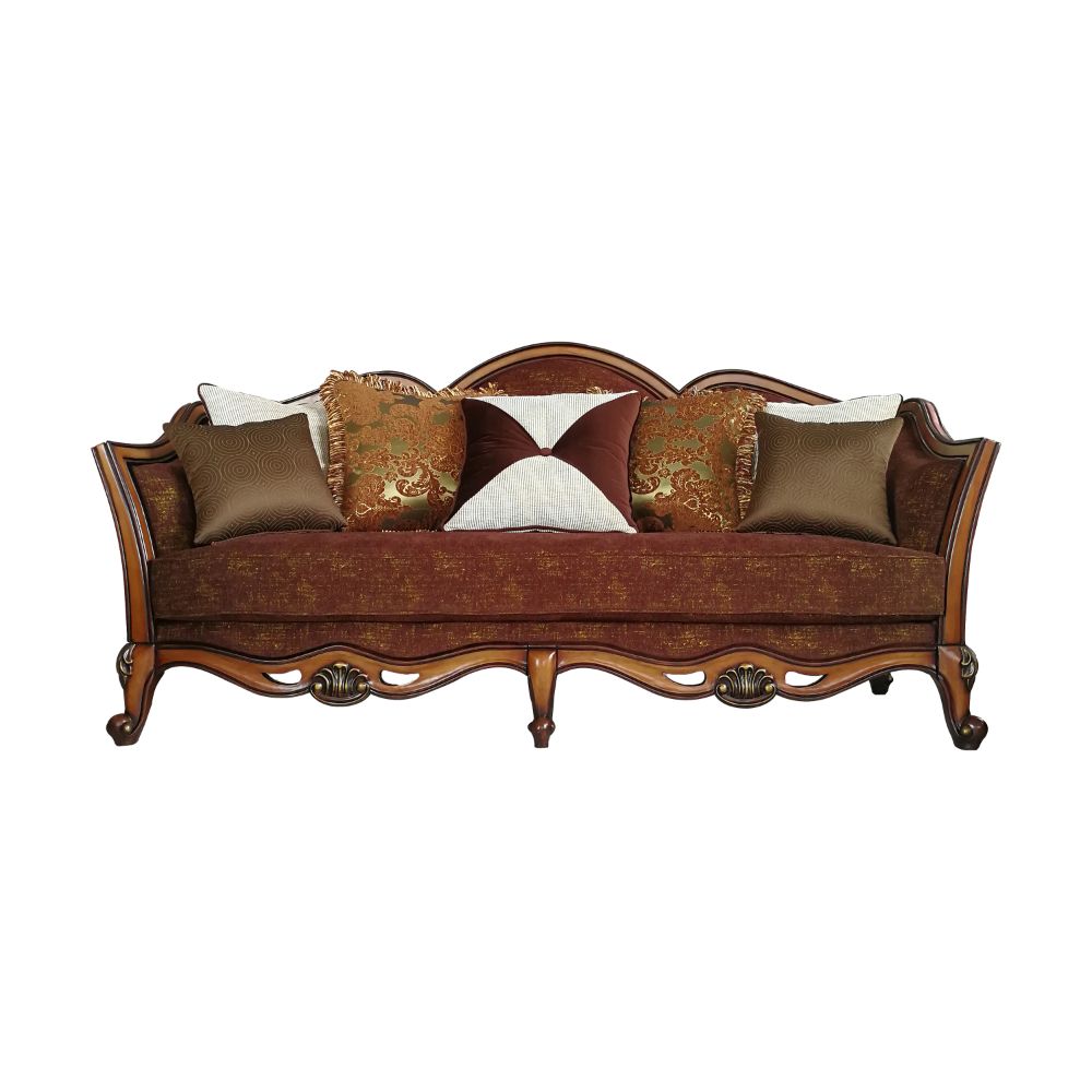 Assambled, w/7 Pillows Carved-Grooved Trim with Welt Trim: 2-Tone with Contrast Gold-Brush Accent, Poplar Wood (Backrest, Armrest & Base) Backrest Style: Arched Tight Back & Loose Seat Cushion (1+1) Seat Construction; Frame Hardwood, Pocket Coil Included, Streamlined Cushion w/Welt Trim, Not Reversible Armrest: Sloped Wooden Queen Leg: Rubber Wood Material: Fabric (Backrest Solid Pattern, Front & Cushion 2-Tone Pattern) Pillows: Contrast Shapes & Patterns, Removable Cover
