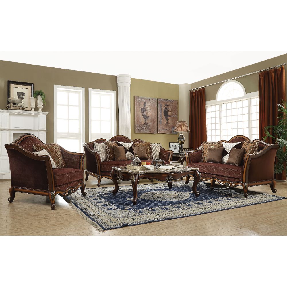 This stylish and delicate sofa set blends classic antique oak color and curved backrest elements into one. The light two tone contrast gold-brush antique finished, classical fabric covered side arm and plush seat support you in lavish comfort and extraordinary style. Add this beautiful set to your living room to create a romantic and stylish space that everyone will admire.