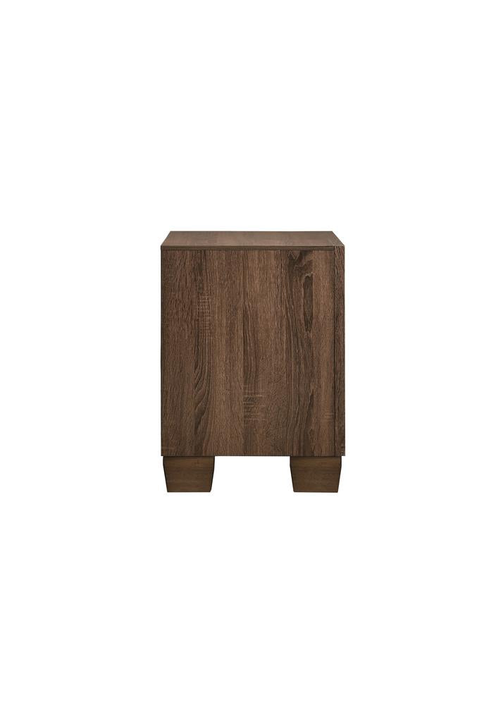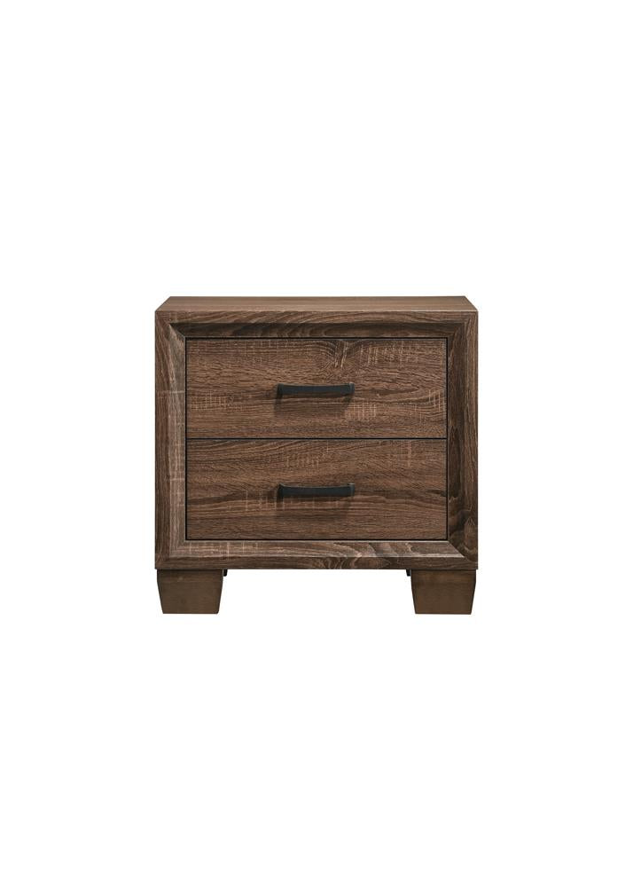Transform a retro scheme with the charm from this transitional two-drawer nightstand. Framing the smooth drawer fronts are contrast black recessed grooves. With a nod toward mid-century modern-inspired design, the sleek silhouette features tapered legs. Medium warm brown hues and deep metallic hardware add a timeless quality to any space. The rich tones are streamlined with elongated details.