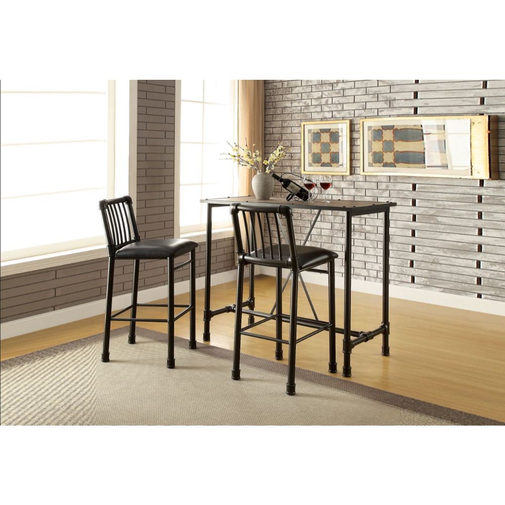This contemporary Caitlin bar set is perfect for any dining, bar or game area. The bar table in rustic oak finish features an interesting metal pipe designed bottom. The bar chairs feature low slatted back, metal pipe frame and upholstered seat covered in black faux leather.