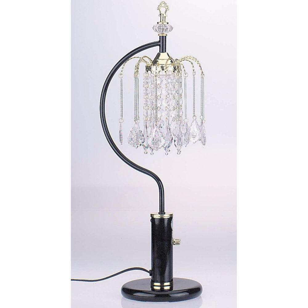 This petite table lamp with chandelier inspired, crystalline shade will impress friends and family alike. Add a luxurious accent to any room with this elegant arc-style 27-inch metal accent table lamp. Uses Type B 40w, Socket Type E27 Porcelain, One Lightbulb Included.