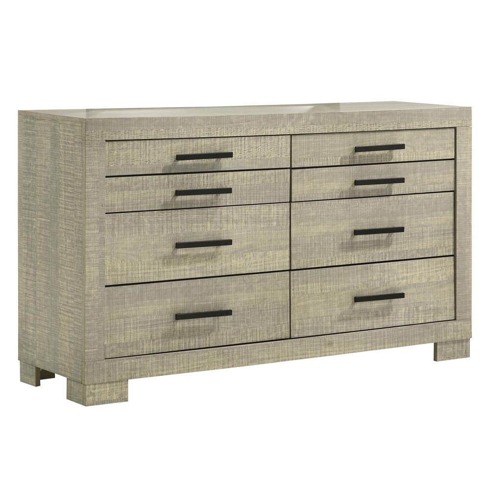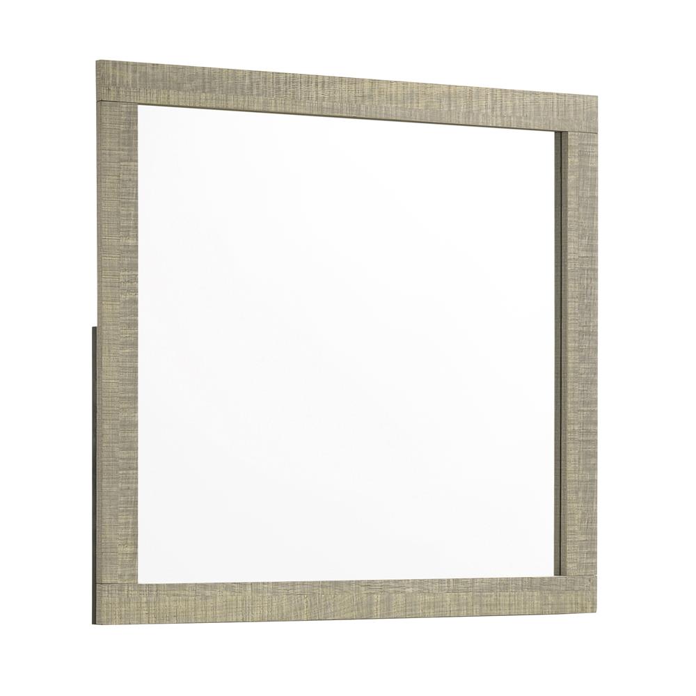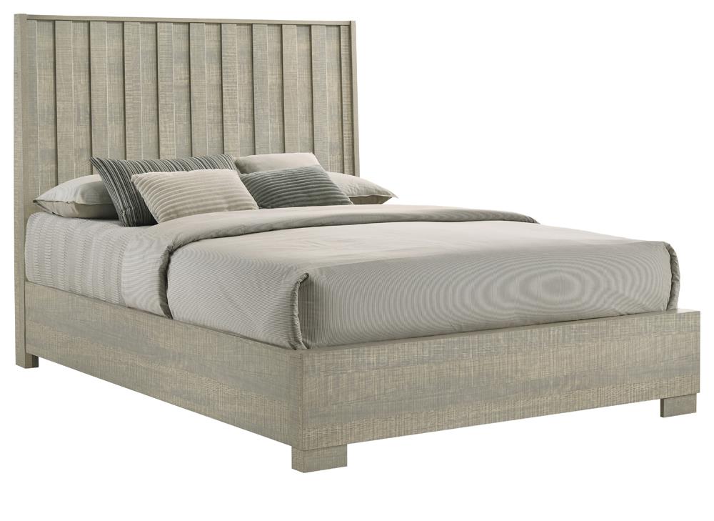 Make the most of a rustic modern motif in a stylish master or guest suite. This four-piece bedroom set leans toward simple in silhouetting and adds a fresh contemporary look with a hint of softness. Rough sawn gray oak finish Asian hardwoods and wood products join smooth melamine to create a stellar feel. A paneled bed with a tall headboard featuring vertical slats anchors this fashionable set, as graduated drawer fronts on case pieces open and close with gunmetal finish hardware. Set includes one bed, one nightstand, one dresser, and one mirror.