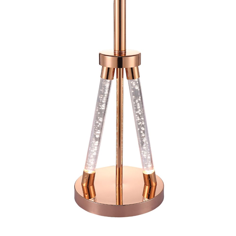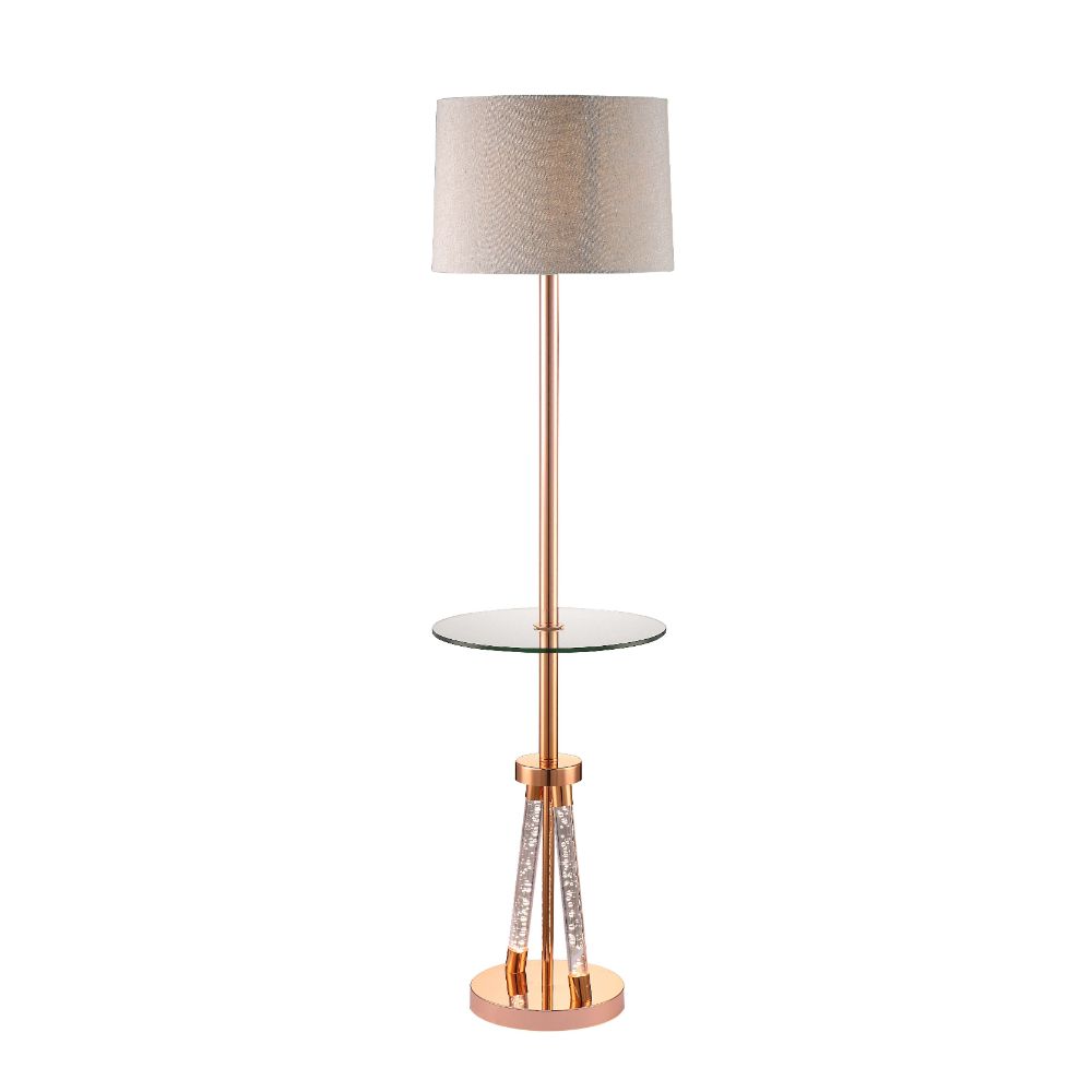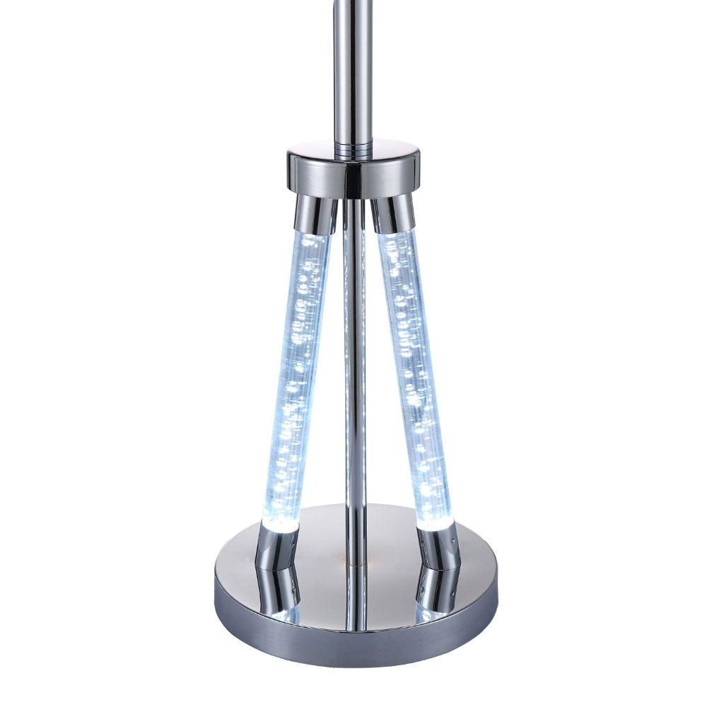 Floor Lamp with Glass Table: 15"Dia x 8mm Clear Tempered Glass, Not Beveled (380mm) LED Light Bulb / Acrylic Cylinder with Motion Glitter Light Bulb Required Type: E26, 9W x 1Pc Switch Type: 4-WAY Rotary Switch at bulb socket (1. Main light, 2. Nigh Light, 3. Main Light and Night Light, 4.Off) Drum Shade: Light Brown Fabric Base Material: Chrome Finish Metal, Acrylic Base with SMD LED Module - 2 sets Clear Acrylic Cylinder includes glitter that swirls reflecting vibrant light.