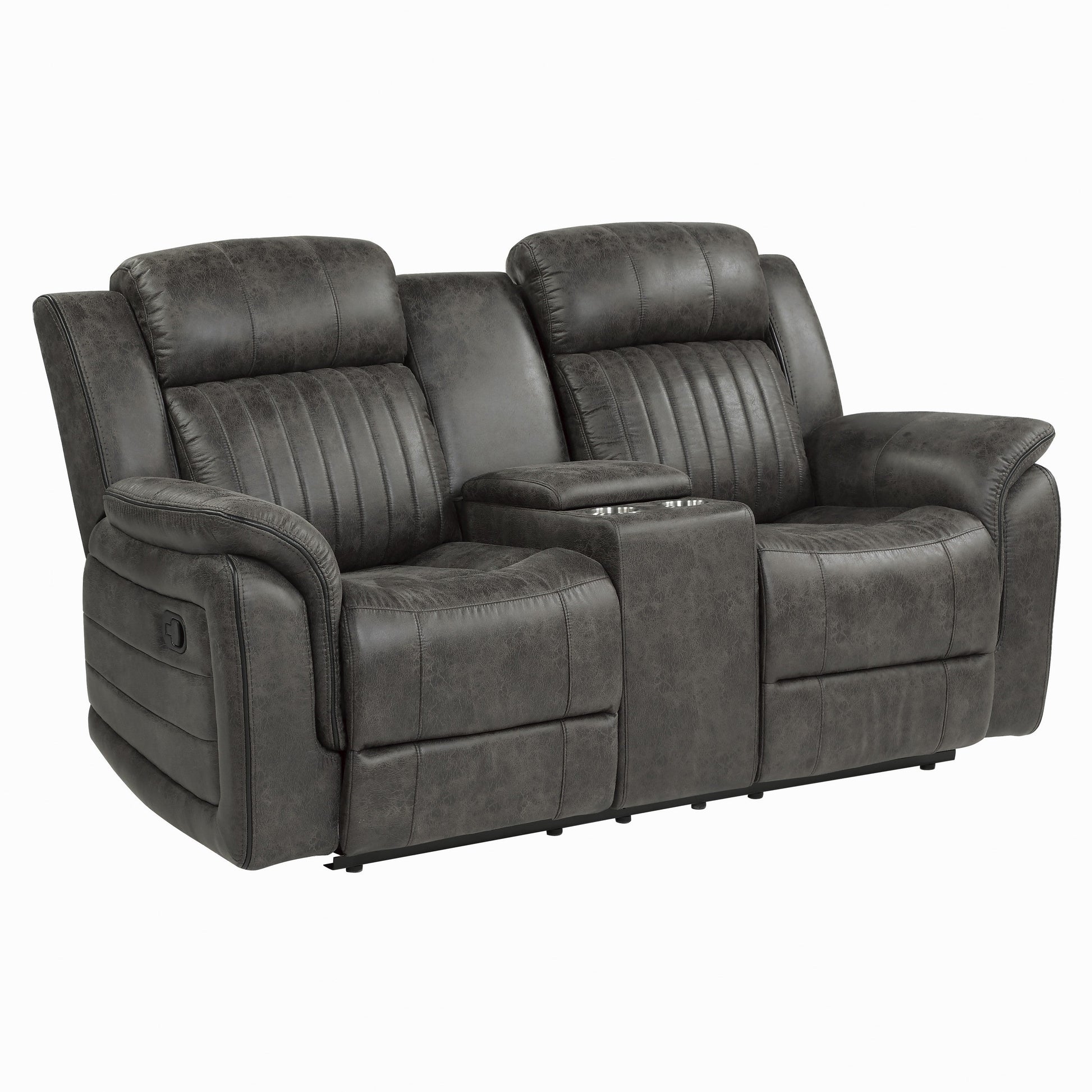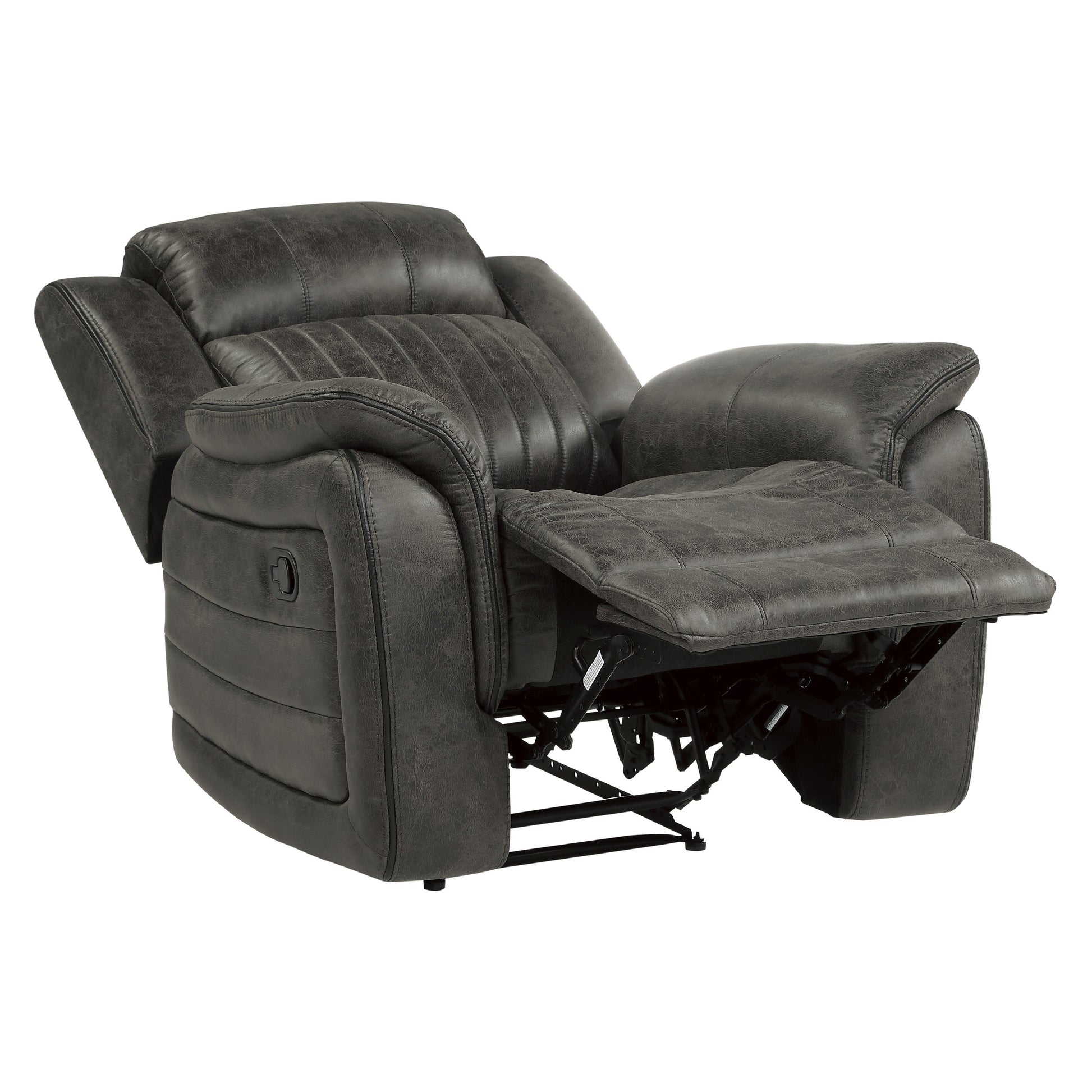 The design of the Centeroak Collection provides a platform for your relaxing downtime. From the classic transitional style to the versatile neutral color of the brown-ish gray polished microfiber fabric covering, this chair is the perfect addition to your living room. Plush seating features vertical tufting, pillow-top arms, enhanced by the reclining mechanism which is engaged with a pull of the side mounted tab, taking you from seated to prone in an easy motion.