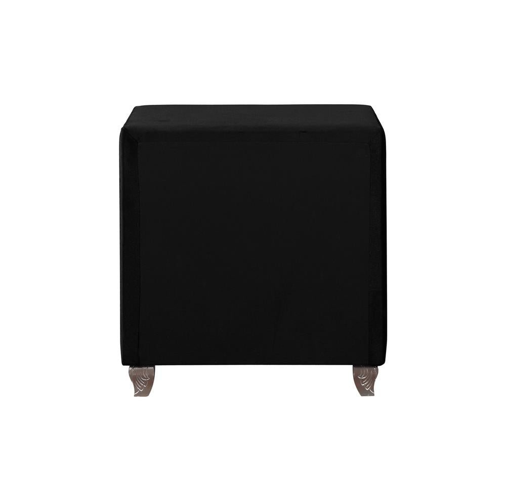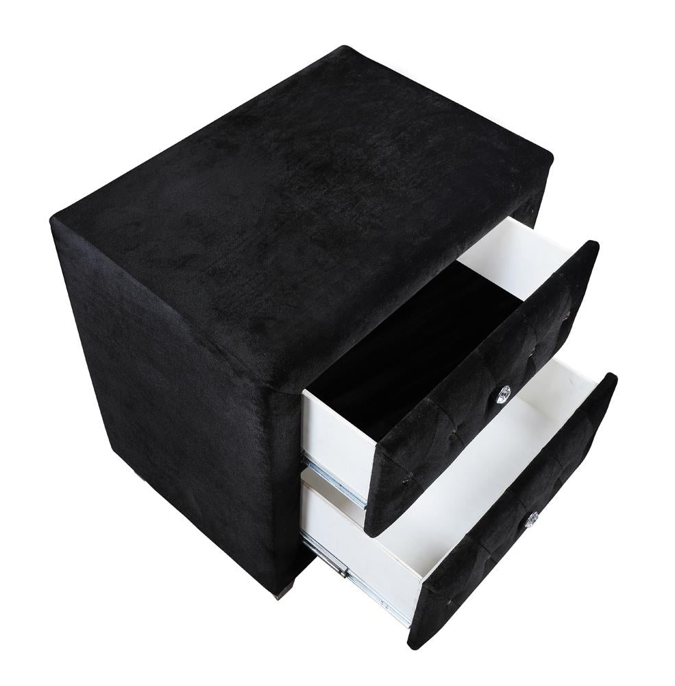 Glamorous and streamlined, this two-drawer black nightstand is full of fun details. Great for a chic bedroom, the sleek silhouette is covered in velvet fabric for a luxurious feel. Curved metallic legs add an extra layer of sophistication. Full of shine, the drawers feature crystal drawer pulls and lines of crystal button tufting. Decorate with a mirrored vase or jewelry box for a full-on stylish look.