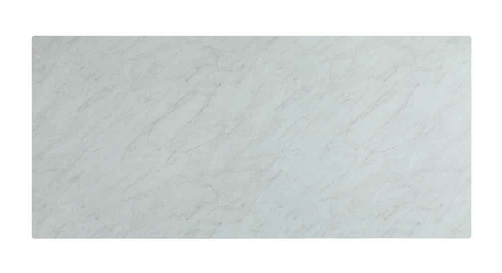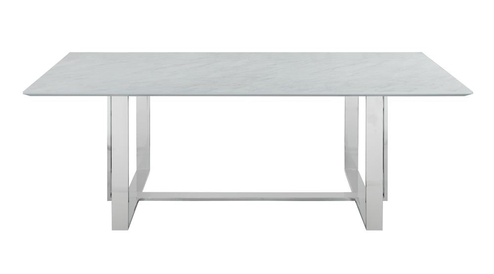 Ultra-modern and versatile, this rectangle dining table features a minimal design and a clean silhouette. Capable of seating up to six, is spacious tabletop features a thick, tempered glass and a faux marble design. Plus, the top also offers a heat resistant and water-resistant material, able to withstand warm plates and spills. The trestle-inspired base is made of slim braces in a lustrous chrome finish. Elevate this dining table with elegant centerpiece for a more formal room.