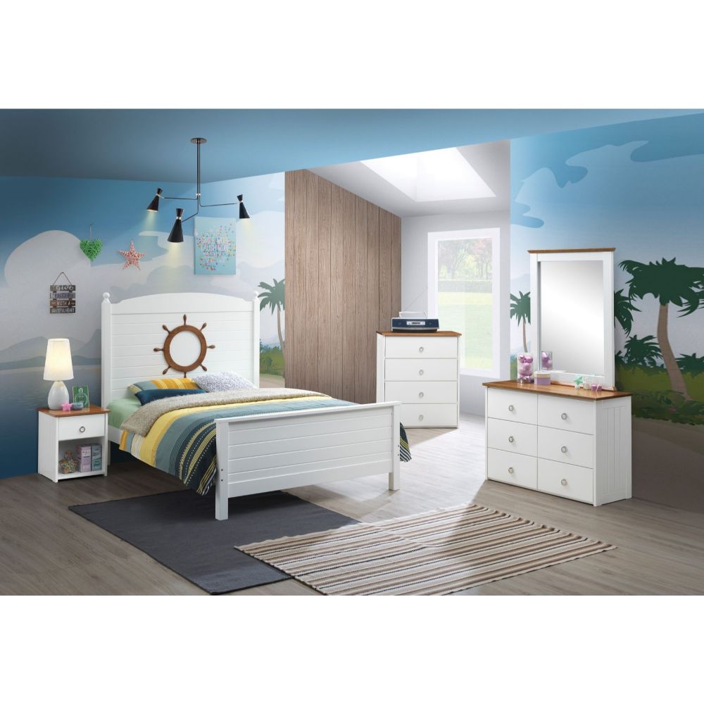 The Farah youth bedroom collection is the perfect addition to any child s room. This cottage style bed features a panel headboard with low profile footboard, crafted with a timeless look that is an ideal addition to any bedroom. The bed is accented with square legs and a horizontal slatted design and turned posts in an understated white finish. The bed s nautical design will go with various styles of case good finishes and will become the focal point for your kids bedroom.