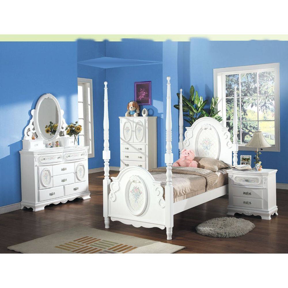 The Flora bedroom features beautiful floral motif decals, oval rope molding and decorative profiled crown molding on all cases. This beautiful girl bedroom is perfect for your favorite princess.