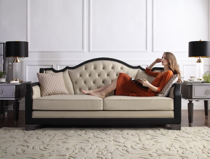 A combination between simplicity and exquisite; this House Beatrice sofa set offers a glamorous focus. Solid structure beautifully upholstered with faux leather. Featuring button tufted backrest and nail-head trim, the hand-crafted pieces enhance the beauty of the detailed wood work and craftsmanship. Superb in its attention to details, every inch is a statement of outstanding elegance and style.