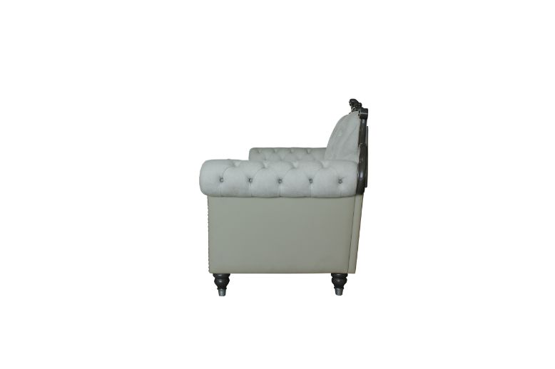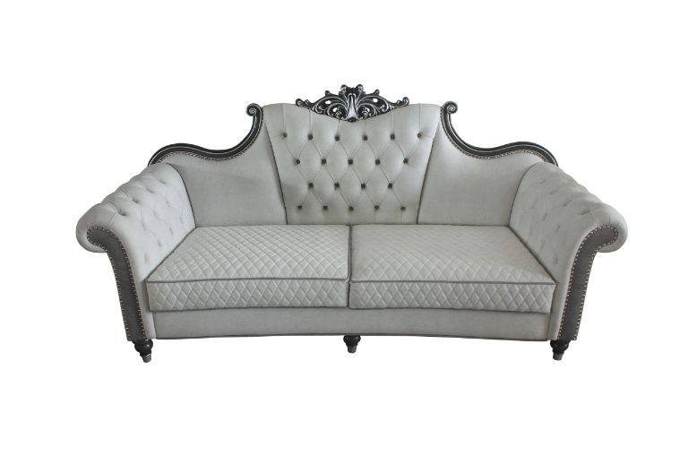 Elegantly designed, this House Delphine collection sofa set offers all the charm you could ask for in a sofa set. This collection features a beautifully crafted scroll motif design on top and button tufted armrests and backrests. In a ivory fabric, beige PU & charcoal finish are a perfect combination of refined colors. The nail-head trim accents and diamond-quilted seats are the timeless finishing touches that bring this set together.