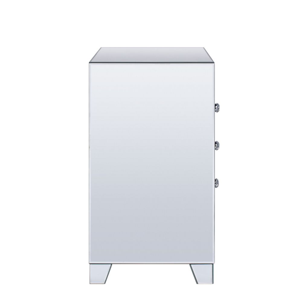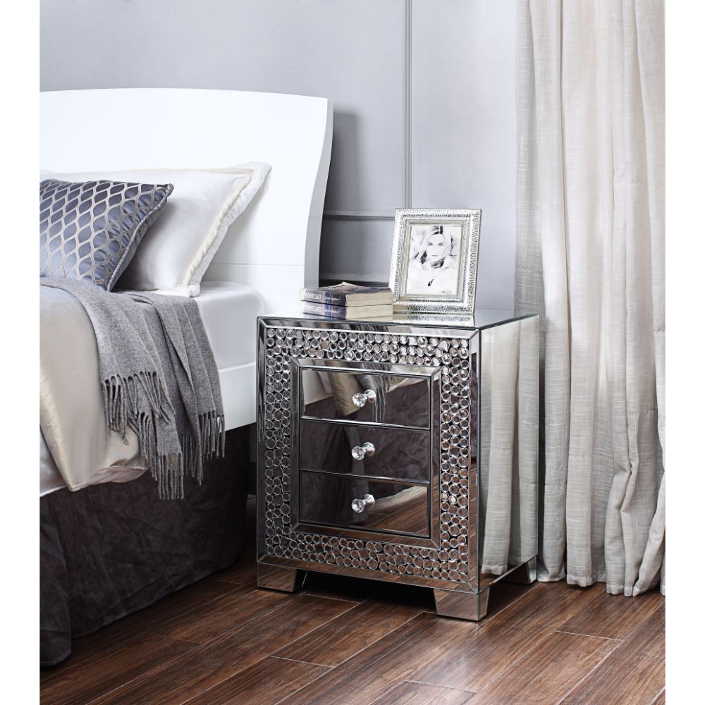 The Kachina End Table will give any room a touch of glamour. This contemporary nightstand is fully mirrored with a beveled edge and a stunning mirror top and is trimmed with a faux gem inlay. Use this unique piece as the perfect accent for any room Decor. Three drawers provide ample and convenient storage for books, remote controls, jewelry, and more.