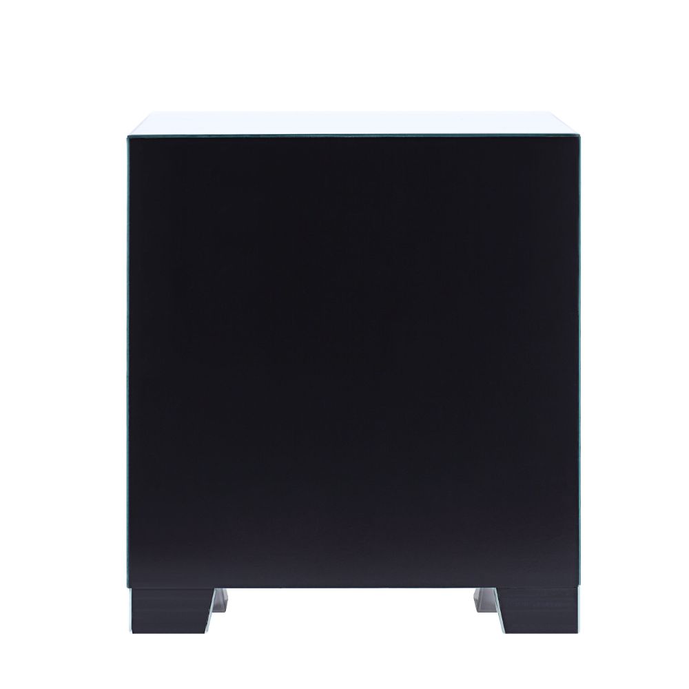 Assembled, Rectangular Night Table Storage: 3 Drw () Features: Beveled Mirrored Finish, Tapered Leg (Back Unfinished) Orientation: Free Standing CONSTRUCTION: Mirrored Case Frame/Leg: 4mm Mirror w/Beveled Edge, MDF Drawer: GLIDE Side Metal (2/3 Ext.), DOVETAIL French Front, Full Black Finish Inside (Felt NOT Included), Safety Stop Included, Manual Close, Hardware: Single Knob