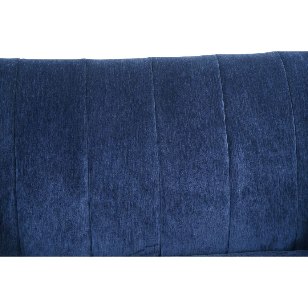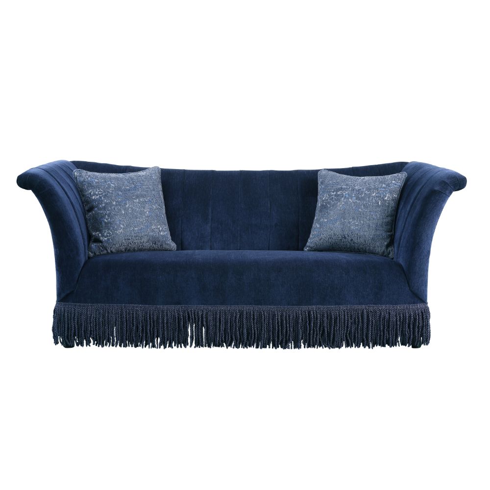 w/2 Pillows (Down Feather) Includes: Bullion Fringe Base (Sofa & Love) Tight Back & Seat Cushion (1+1) Backrest Style: Arched, (Barrel Chair) Seat Construction: Tight Streamlined Cushion, Full Foam Fill, Inside Frame: Solid Wood Armrest: Flared Wood Leg: Black Finish, Leg Size: 3 Inches Height Material: Dark Blue Fabric (Solid Pattern) Pillows: Contrast Pattern, (Removable Cover & Down Feather Fill)