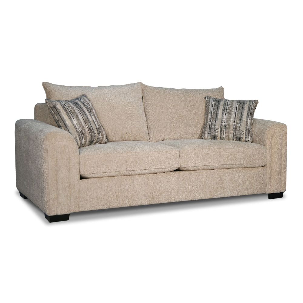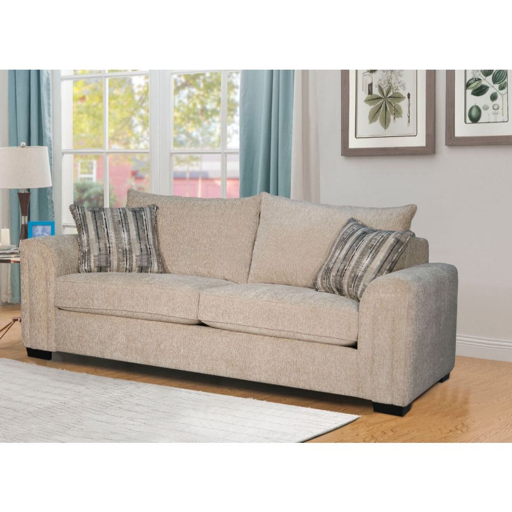 w/2 Pillows, Loose Back & Seat Cushion (2+2) CONSTRUCTION Full Foam Seat (Dacron Wrapped); Inside Frame: Wood (Northwest Hardwood, Ply, Composite Hardwood), Box Cushion w/Welt () BACKREST: Knife Edge Cushion ARMREST: Flared Style Wood "L" Shape LEG: Black Finish; Leg Size: 3 Inches Height Material: Fabric () Pillows: Square Shape, Size: 18 x 12 Bolster, Fiber Filled (Contrast Pattern)
