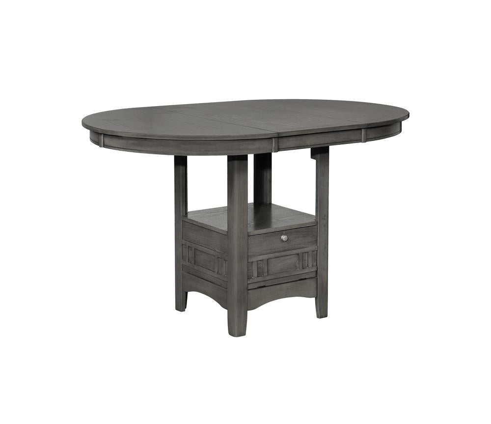 Inspire a casual, pub-like atmosphere with this charming counter height dining table. Transitional design is clean, with understated flourishes like arched molding and slat trim. A medium grey finish works in either a warm or cool color palette, achieving a versatile balance. The center of the table is augmented with an open shelf and closed storage perfect for tucking away linens and accessories in a compact space. When guests arrive, an 18-inch extension leaf adds valuable space.