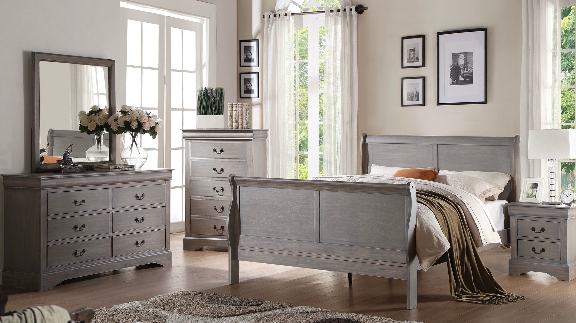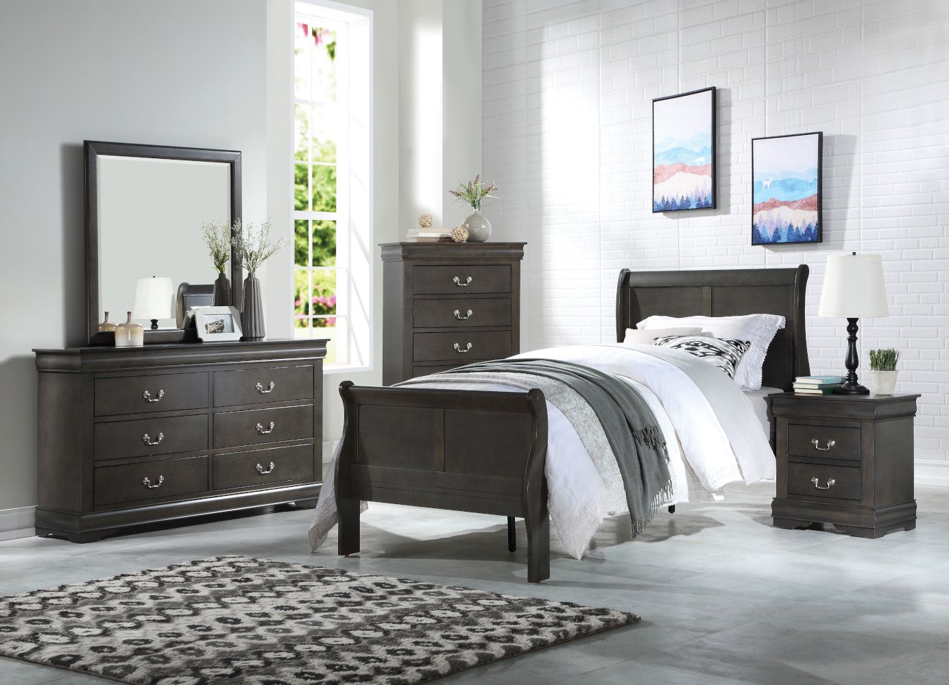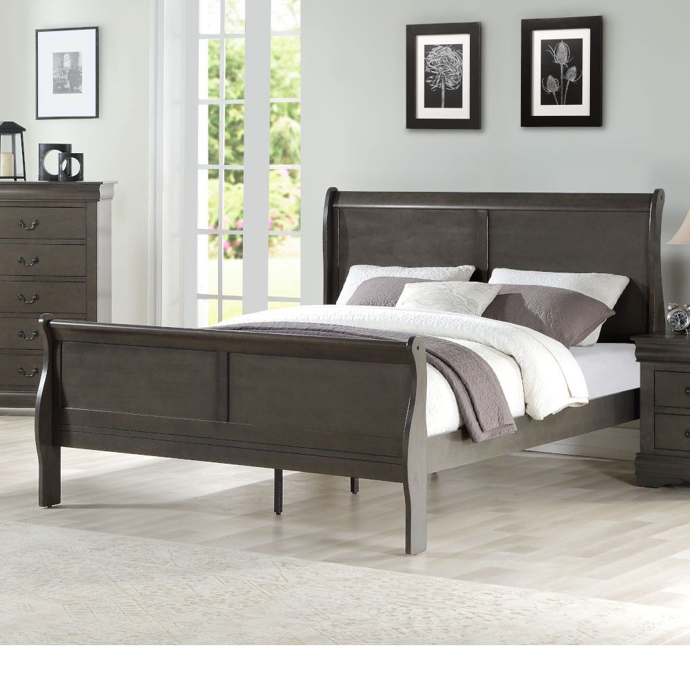 | CLASSIC LOUIS PHILIPPE STYLE BED DISTINGUISHED BY THE SLIGHTLY HIGER HEADBOARD FINISHED IN CAPPUCCINO. DOVETAIL DRAWER CONSTRUCTION, STURDY DRAWER FOUNDATION. CRAFTED FROM WOOD VENEER AND SELECT HARDWOODS. SILVER BAIL DRAWER HANDLES. |