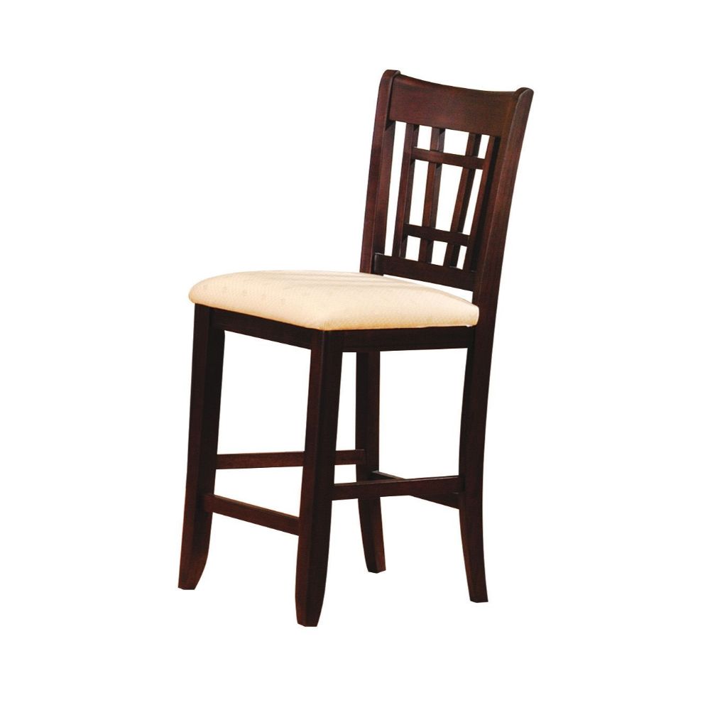 The Lugano bar stool is built of Rubberwood solids and graced by a dark walnut finish. Its curved back has open, mission style lattice detailing. The seat is comfortably cushioned and upholstered in neutral fabric for a welcome contrast to the darker finish. Tapered legs and footrest stretcher bars offer stylish stability.