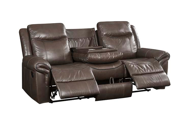 Cuddle up in this decadently plush Lydia sofa set. The set is upholstered in a warm and earthy brown leather-aire. Distinctive elements include wraparound padded armrests, along with a few hidden surprises. The richly styled reclining sofa features a drop-down tabletop with cupholders and AC power and USB ports to accommodate the modern home. The loveseat includes a center console that also features cupholders and AC power and USB ports. The recliner features a gliding mechanism for added comfort.