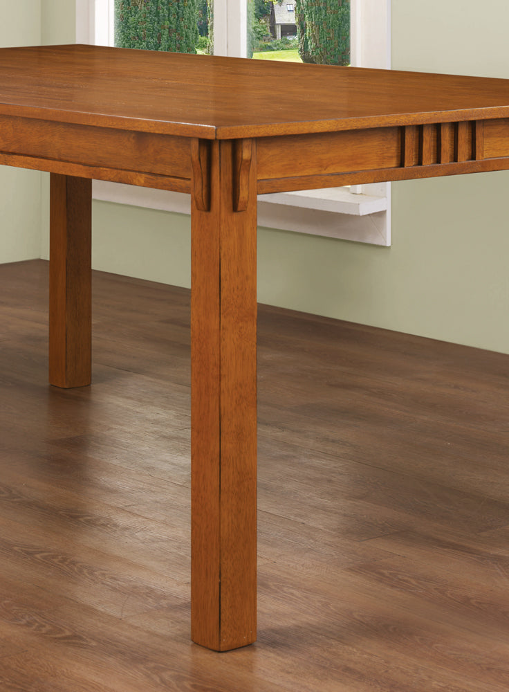 * Exposed tenon joints and linear fret work create a great mission style dining collection
