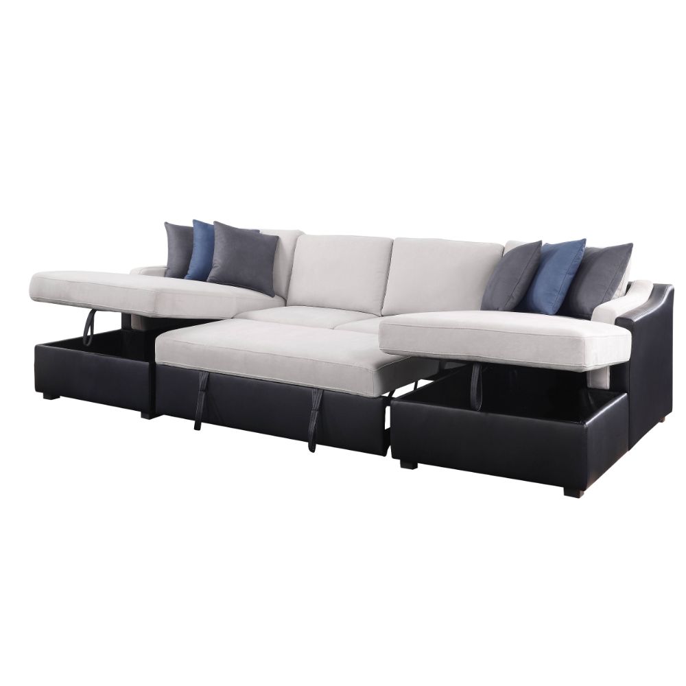 The Merrill sectional sofa provides ample space for snacking, snoozing, and relaxing! Upholstered in a sharp combo of beige fabric and black PU, this substantial U-shape sectional includes not only a pull-out sleeper with full foam mattress, but also a storage chaise. Square accent pillows are included for extra style while you lounge.
