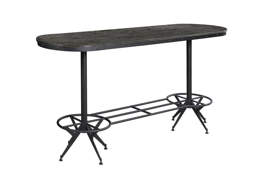 Savor time around this round industrial bar table with loved ones. It showcases a round wood top with wire brushed black tones. The angled legs and footrest are stylishly designed with a warm antique black finish. Stand with one leg on the footrest or slide a bar stool (available separately) up and enjoy yourself. It's the perfect showpiece table for a casual kitchen, home bar, or entertainment area.