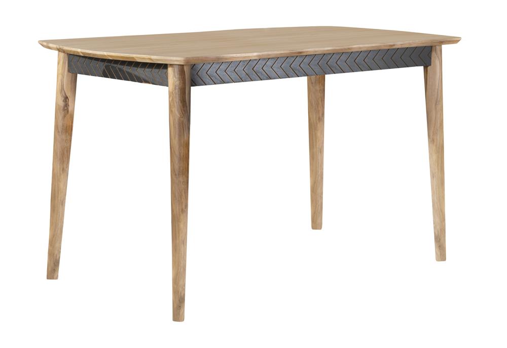 A perfect addition to contemporary homes, this mid-century style counter height table creates a warmth to a dining area with its solid natural Sheesha wood frame. Graceful curved edges and a 45-degree chamfered profile lend a softness and elegance to this furniture piece. Along the apron of this charming contemporary dining piece is an arrow-inspired graphical design in a contrasting black hue that lends a playful touch. Supported by long slender legs that taper toward the feet, this counter height table pushes the vintage vibes. Pull up a counter height stool or chair to seat six family members or guests comfortably.