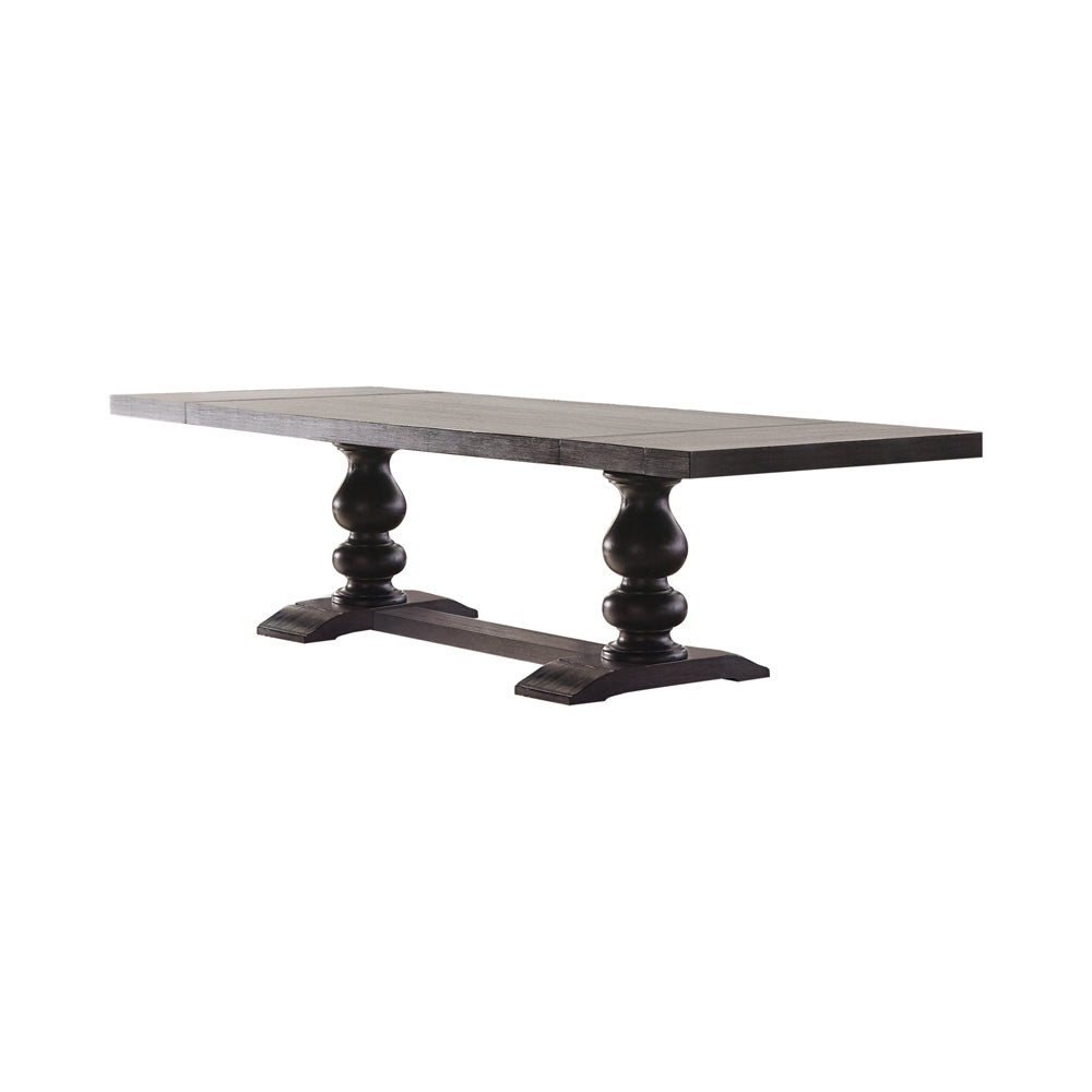 * European traditional dining table in striking antique noir finish paired up with glamorous chairs for a handsome impact
