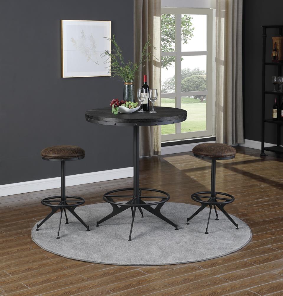 • INDUSTRIAL STYLE OVAL BAR TABLE • PINE VENEER TOP IN BLACK WITH WIRE BRUSHED DETAILS • HEAVY DUTY METAL BASE FINISHED IN ANTIQUE BLACK