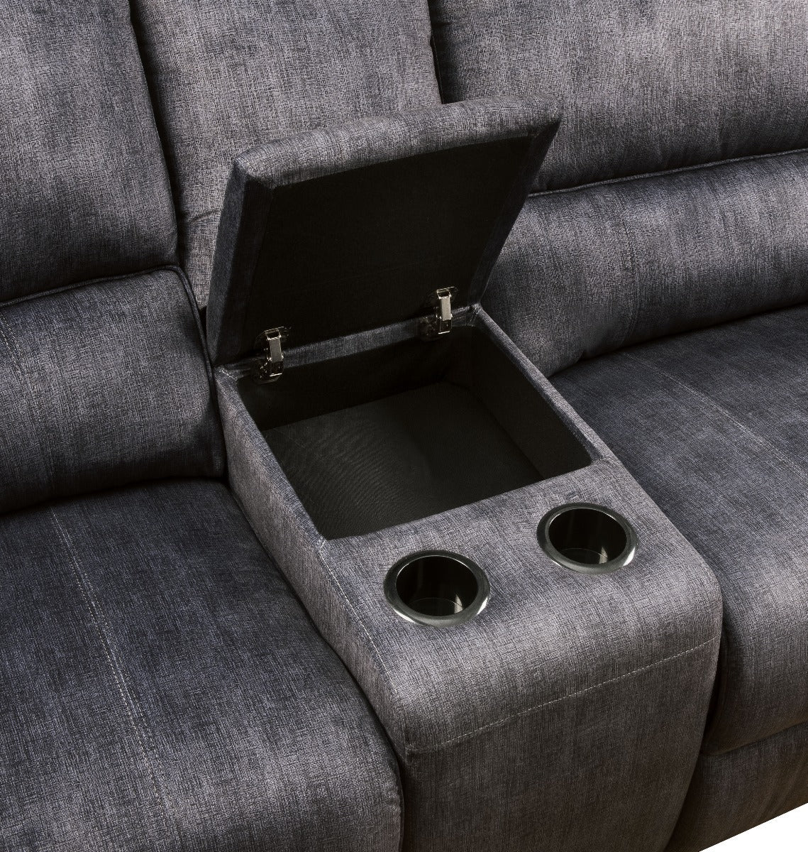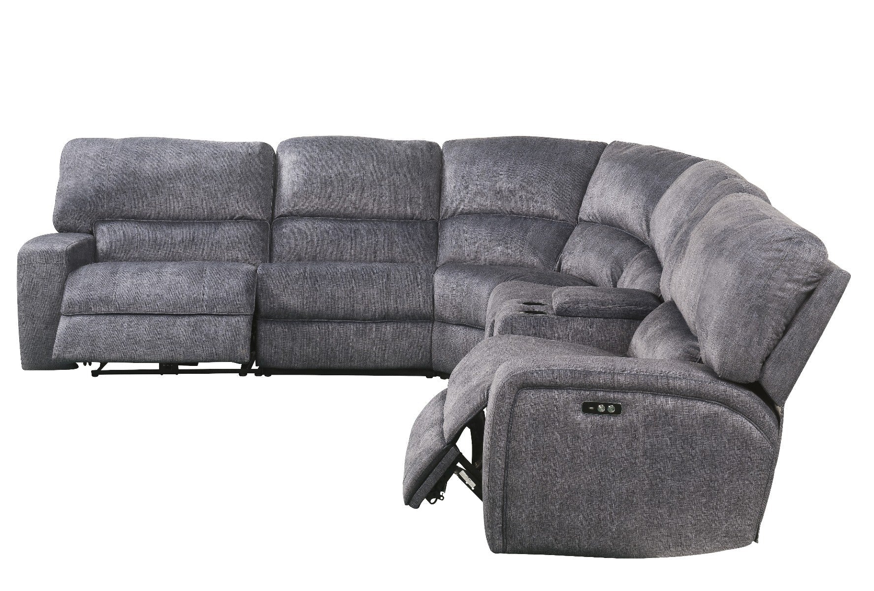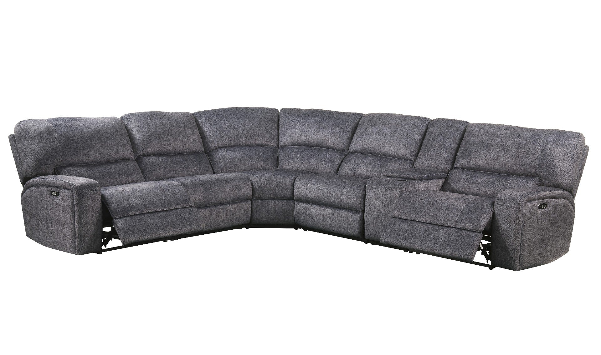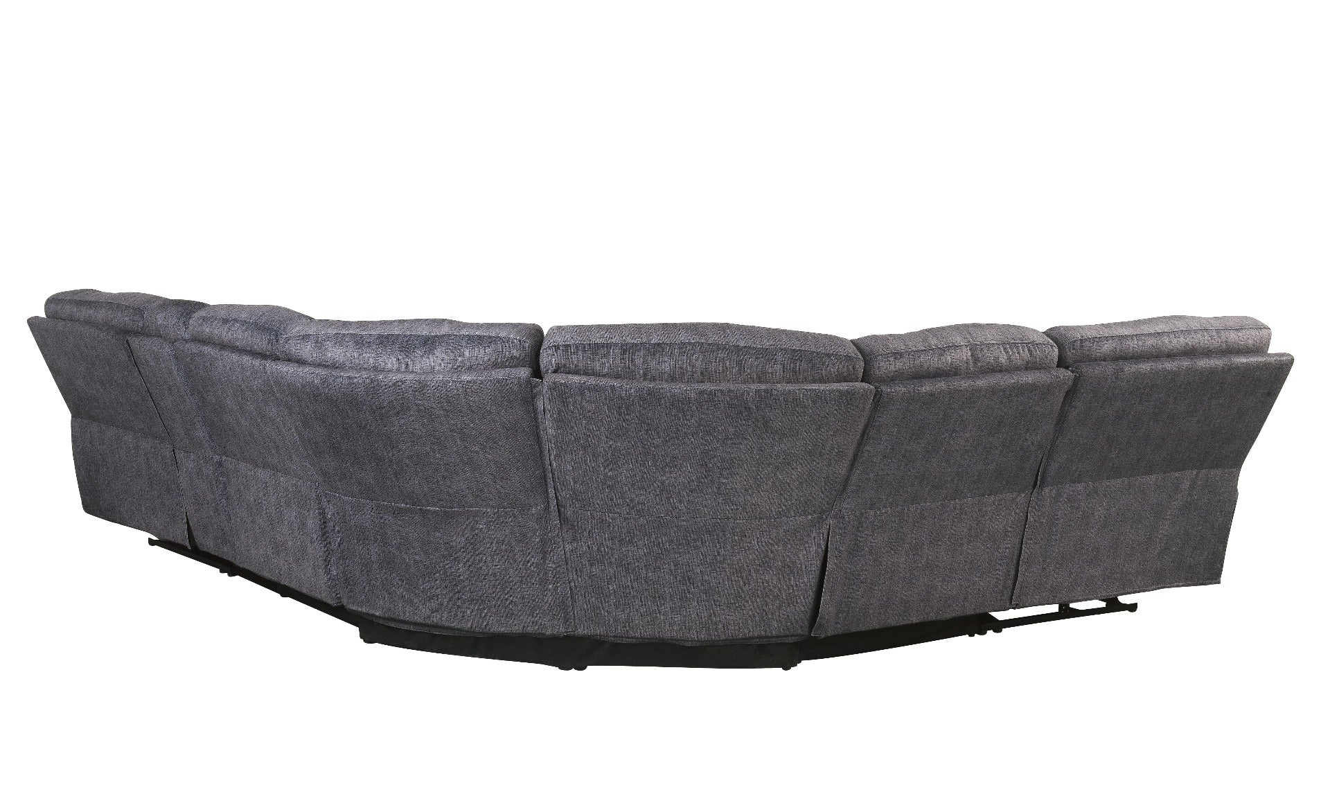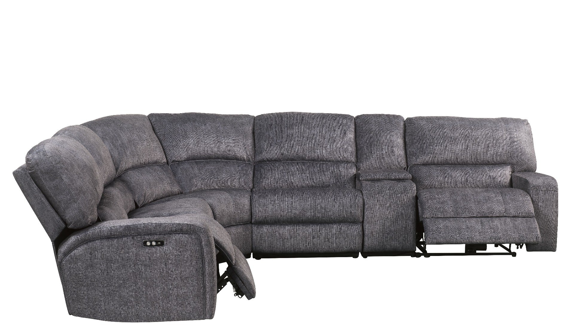 KD, Sectional (Power Motion & 2 USB Charging Docks) "L" Shape (Reversible Console & Armless Chairs) Includes: 2 Reclining Seats (Power Motion LAF/RAF), 3 Stationary Seats (2 Armless Chairs & Curved Wedge), Console w/Storage & Cup-Holder (Safety Hinge) FEATURES: Tight Back & Seat Cushion, Reclining Angle: 135 Degrees CONSTRUCTION Seat: Pocket Coil, Inside Frame: Wood, Ply, Foam Armrest: Wide Track (Block), Size: 23 Inches Height Metal Base with Power Motion: External Push-Button, each with 2 USB Charging Dock (Outside Armrest), OKIN Motor Material: Slate Blue Velvet (Multi-Color Pattern) NO Pillows (No Sleeper, Cover Not Removable) Clearance between Wall & Sectional: 5 Inches (120mm), Reclined Chair Size: 65" Depth, Backrest: 29" Height, Footrest: 20" Height Console Storage Lid: 14" x 13" x 5"H