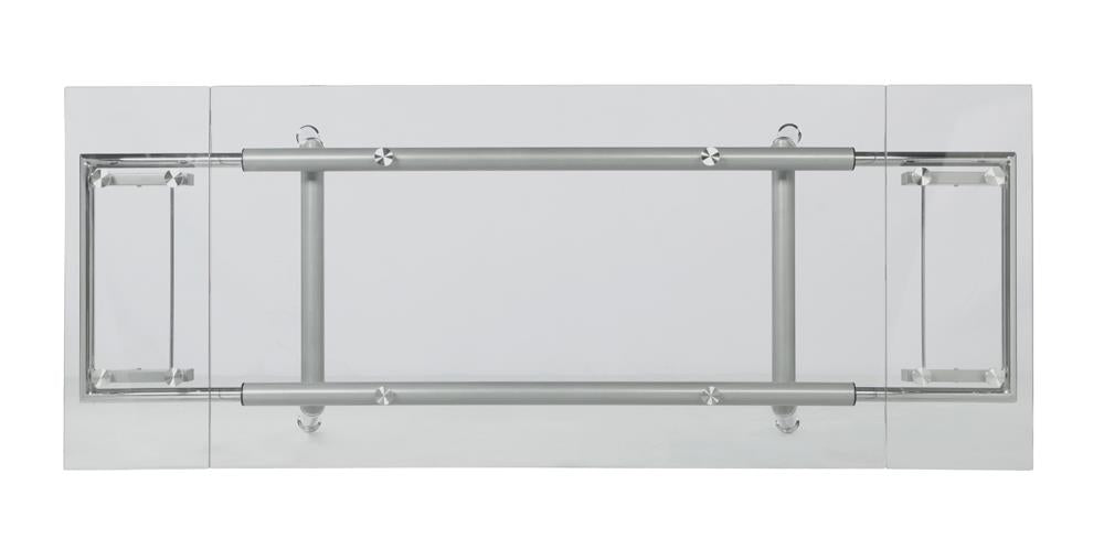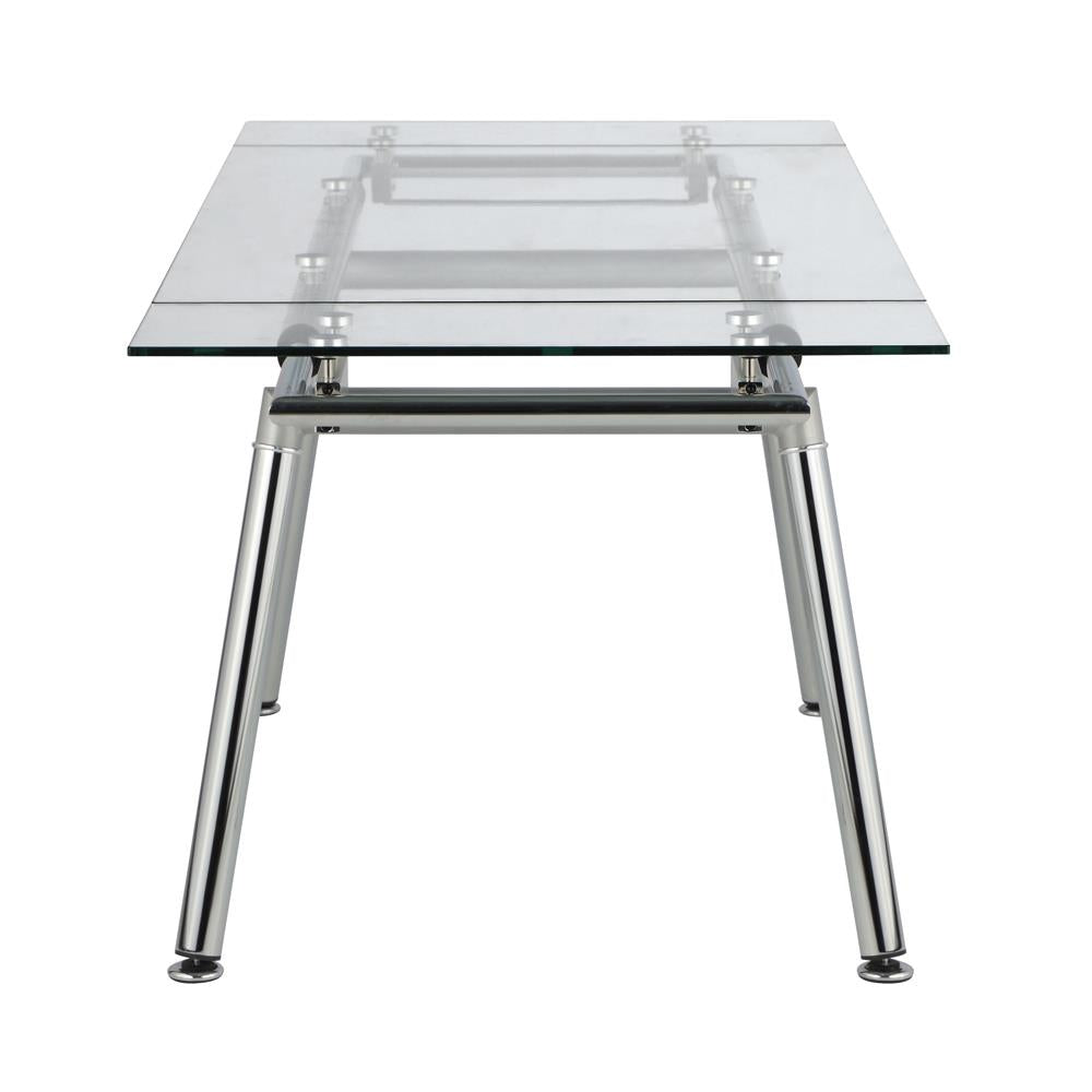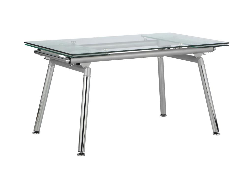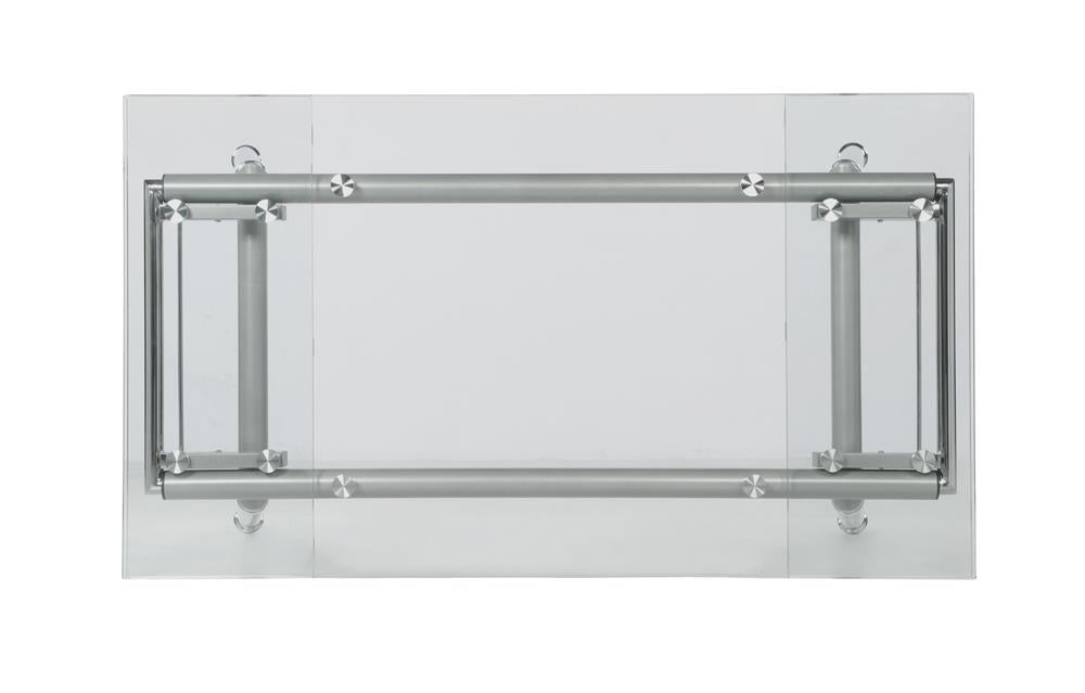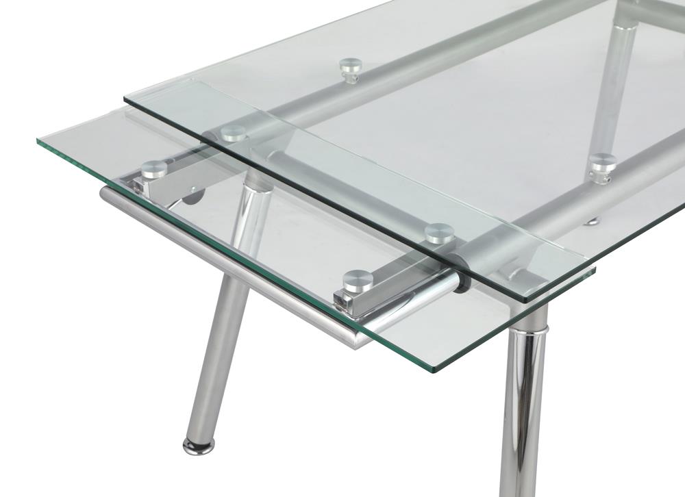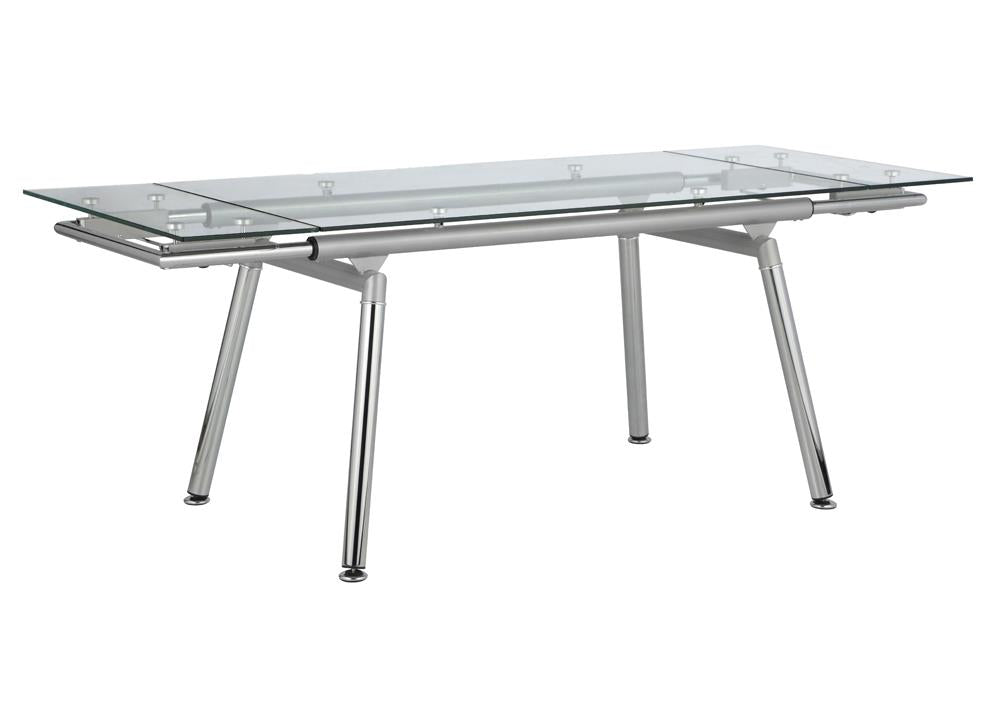 Ultra-modern with a sleek design aesthetic, this dining table is perfectly suited for modern style dining spaces. Capable of seating six guests comfortably, with plenty or elbow room, this spacious table features two 12-inch leaf extensions, one each end, that allow for last-minute dinner guests. Topped with a transparent, thick tempered glass tabletop surface, it offers an open and airy design that allows rugs and chair colors to take center stage. To add to the chic contemporary flair is a shiny electroplated metal finish that lends a touch of glam. Add this dining table to a dining room or media room for family gatherings, game night and more.