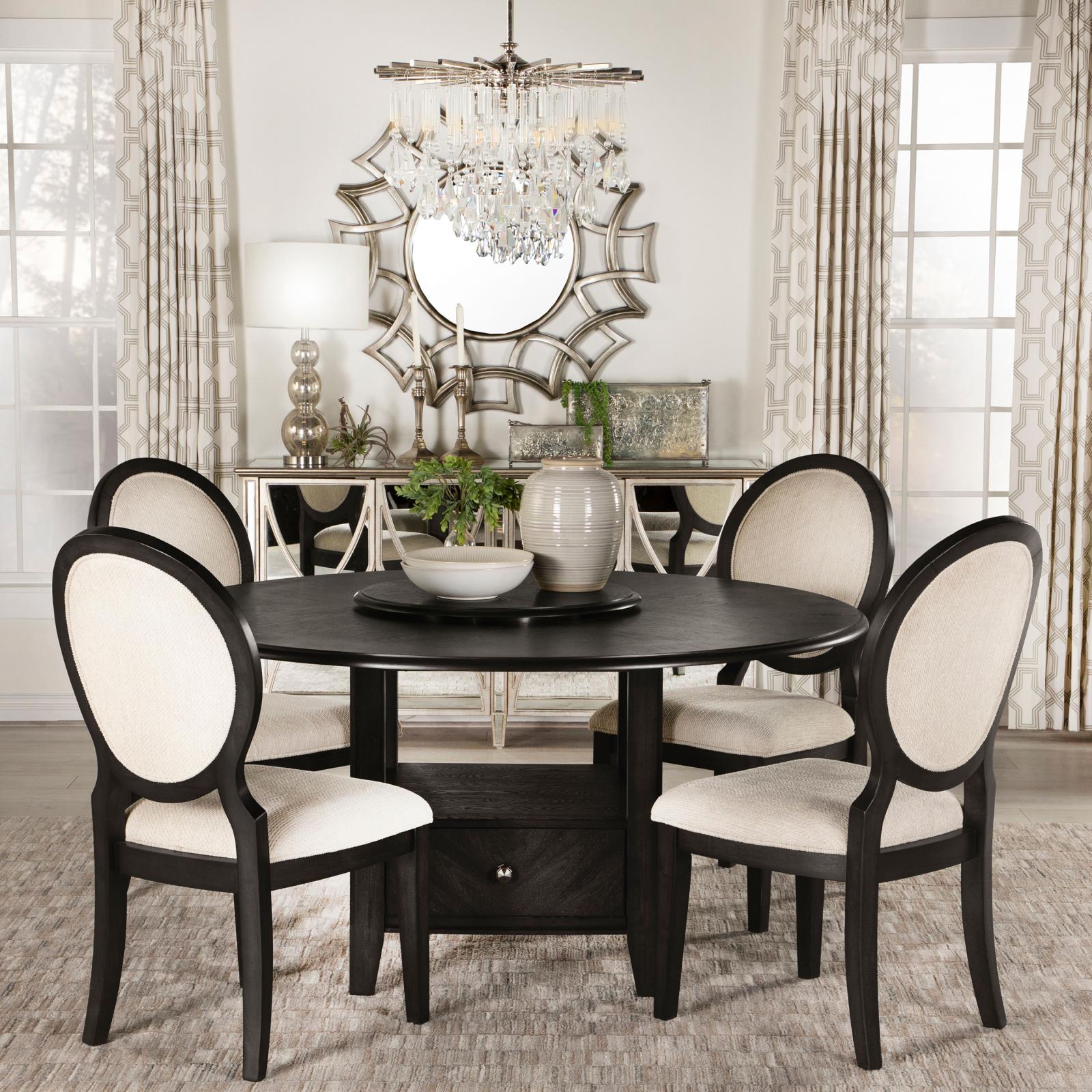 Elevate your dining room into a more formal gathering space with this transitional dining table. Designed with a spacious round tabletop, complete with a 24-inch removable lazy susan, this elegant furniture piece lends itself wonderfully to traditional and more modern homes. Made in a dark cocoa finish that boasts a bold dark hue, the 60-inch round top rests on a pedestal base that offers up a drawer for storing dining essentials. The open bottom shelf above invites you to showcase decor. And with its expansive round top, this dining table seats six family members or guests quite comfortably.