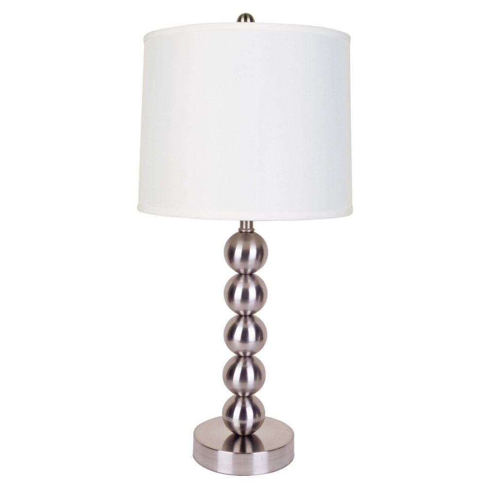 Enhance your room with the Vassy II Table lamp Set of 2. This pair boasts sturdy bases made from metal with a wide, round foot and a center pillar comprised of stacked ball shapes. A metal finish emphasizes the sleek curves of the back. The bulbs are controlled with standard on/off switches with a bright white fabric drum shade to soften the light. Bulbs are not included