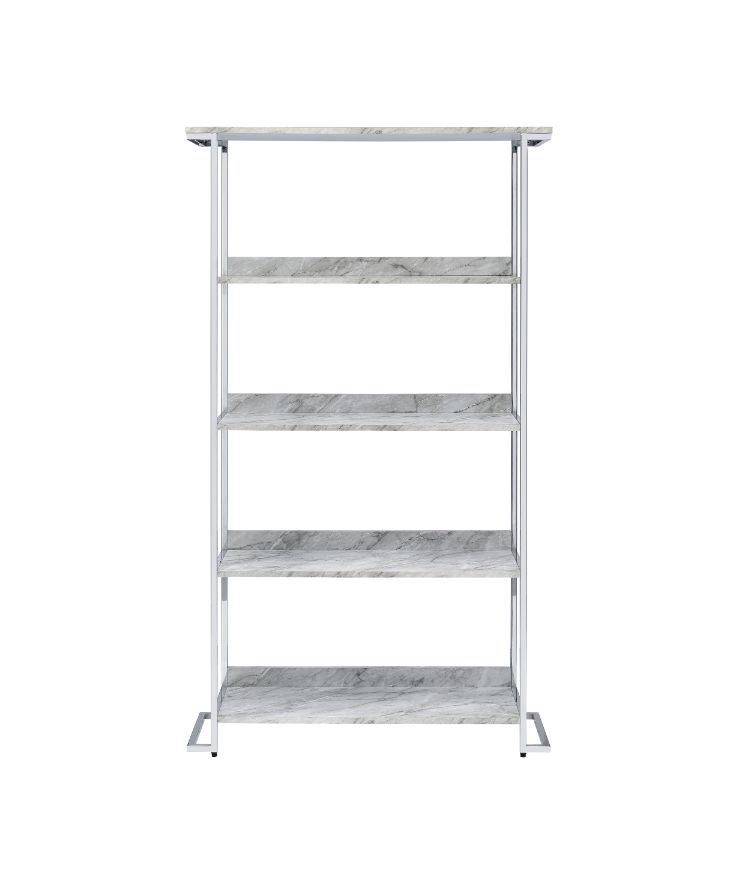 Incorporate well-thumbed books, family photos, and all meaningful objects into your home decor. This five-tier bookshelf provides ample space to store and showcase special items that truly deserve attention. White faux marble shelf features beautiful natural textures to highlight your favorite collections. Sleek chrome metal frame adds strength, durability, and appeal. Simple, contemporary lines and clean color means it can work well in rooms of all styles.