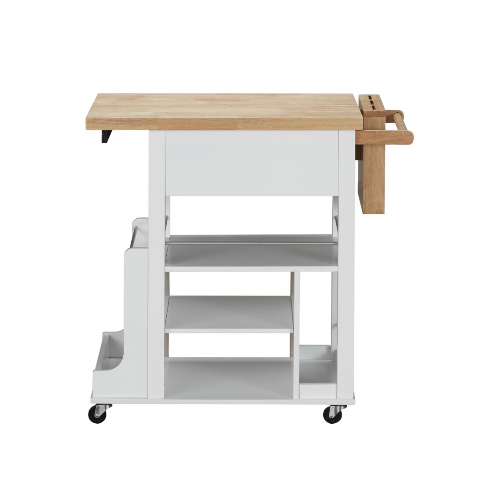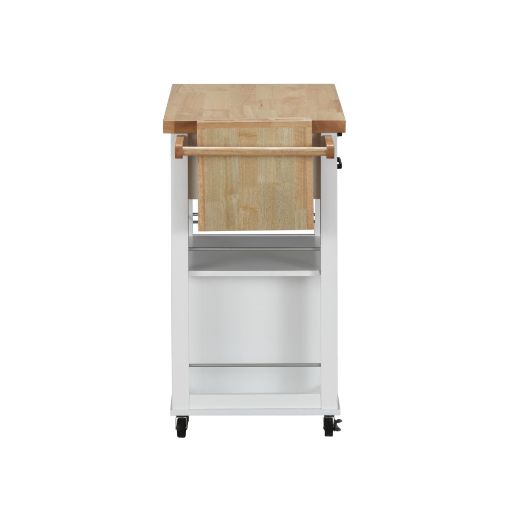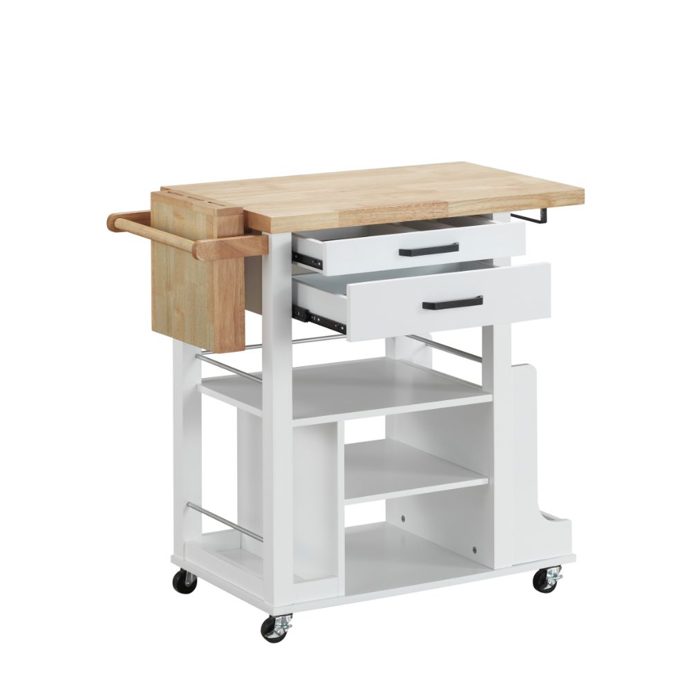 KD, Rectangular Kitchen Cart Storage: 2 Drw, 3 Open Compartments (3 Fixed Shelves), Side Spice Rack Features: Knife Block, Handle/Towel Rack, Casters Wheels (2 w/Lock) Wooden Top & Knife Block: Natural Finish Wooden Frame & Square Legs: White Finish (Open Base) CONSTRUCTION Wood Top & Base: Solid Wood (Rbw), MDF Drawer: GLIDE Side Metal (Full Ext.), DOVETAIL Not Included (Screw Joint), Felt-Lined Not Included, Safety Stop Included, Manual Close, Hardware: Single Handle, Normal Construction, Drawer Size: 16" x 11" x 2"H (Opens One Side Only)