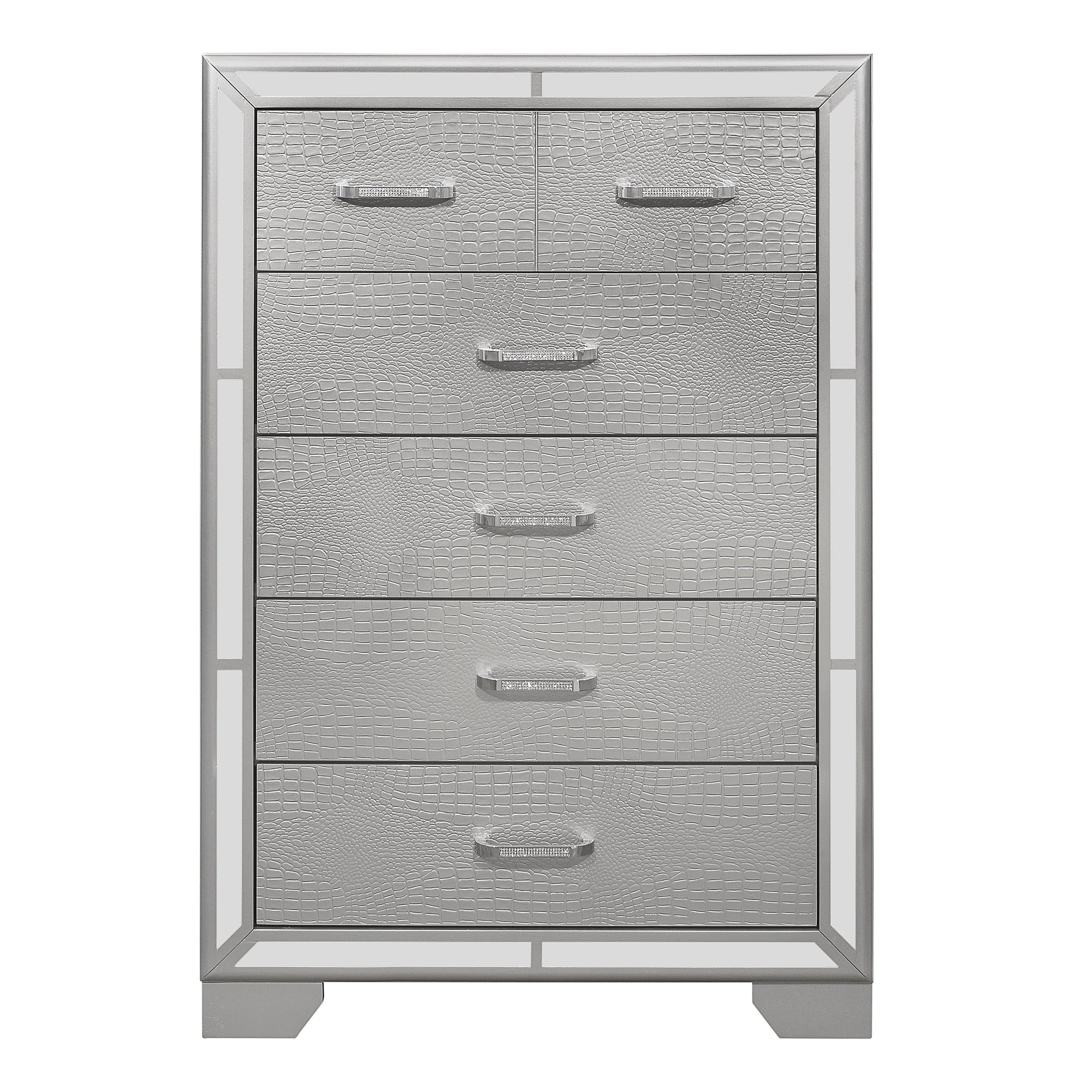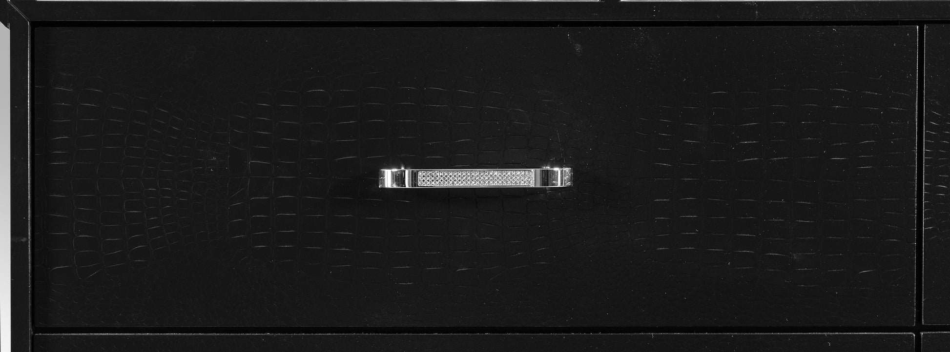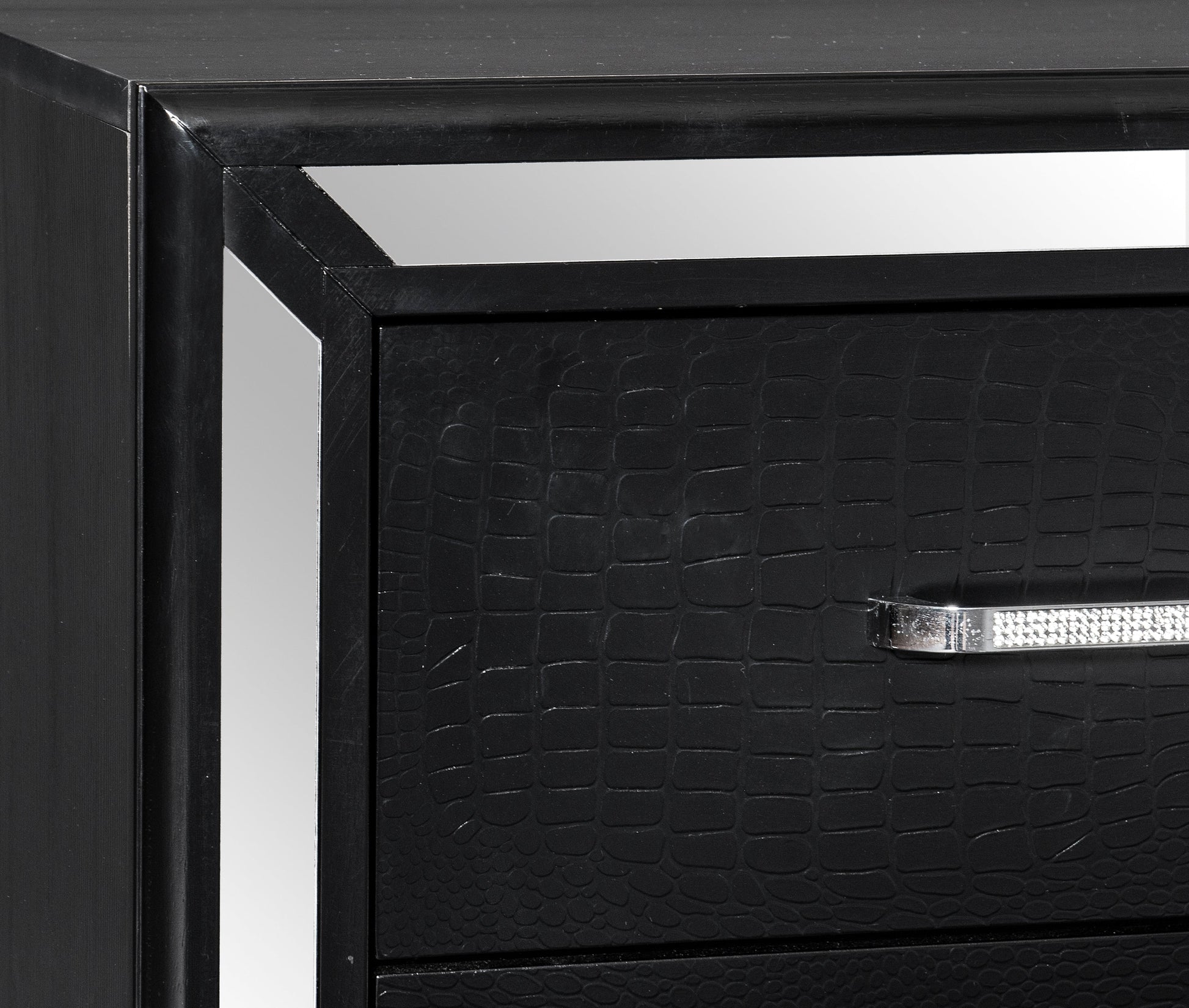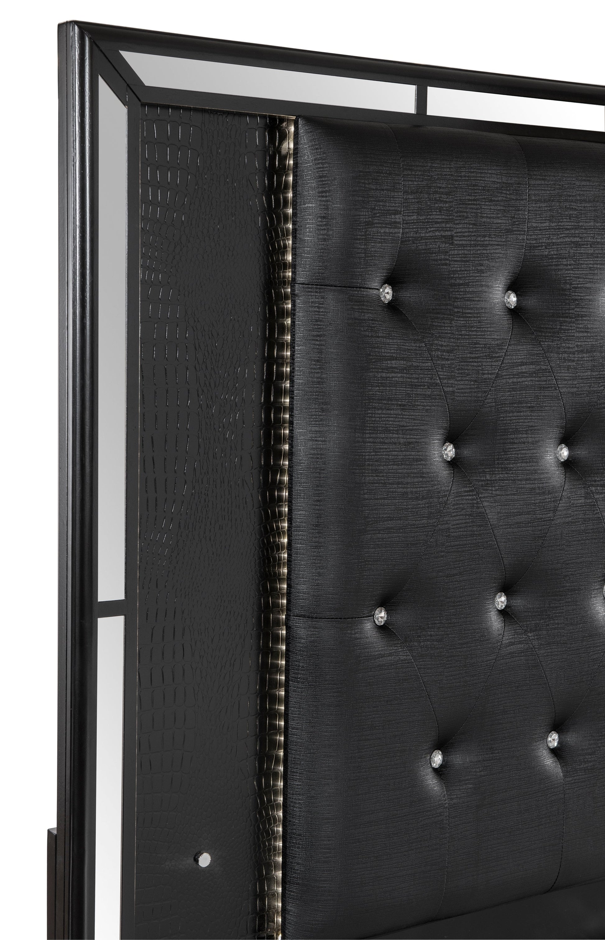 Elegant touches abound with the design of the Aveline Collection. Alligator embossed veneer covers the collection and is finished in black, an elegant palette that beautifully pairs with your bedroom’s accessories and bedding. The headboard is centered with a black faux leather panel that features button tufting and LED backlighting. The queen bed is further accented with mirror trim, reflecting your glamorous style.