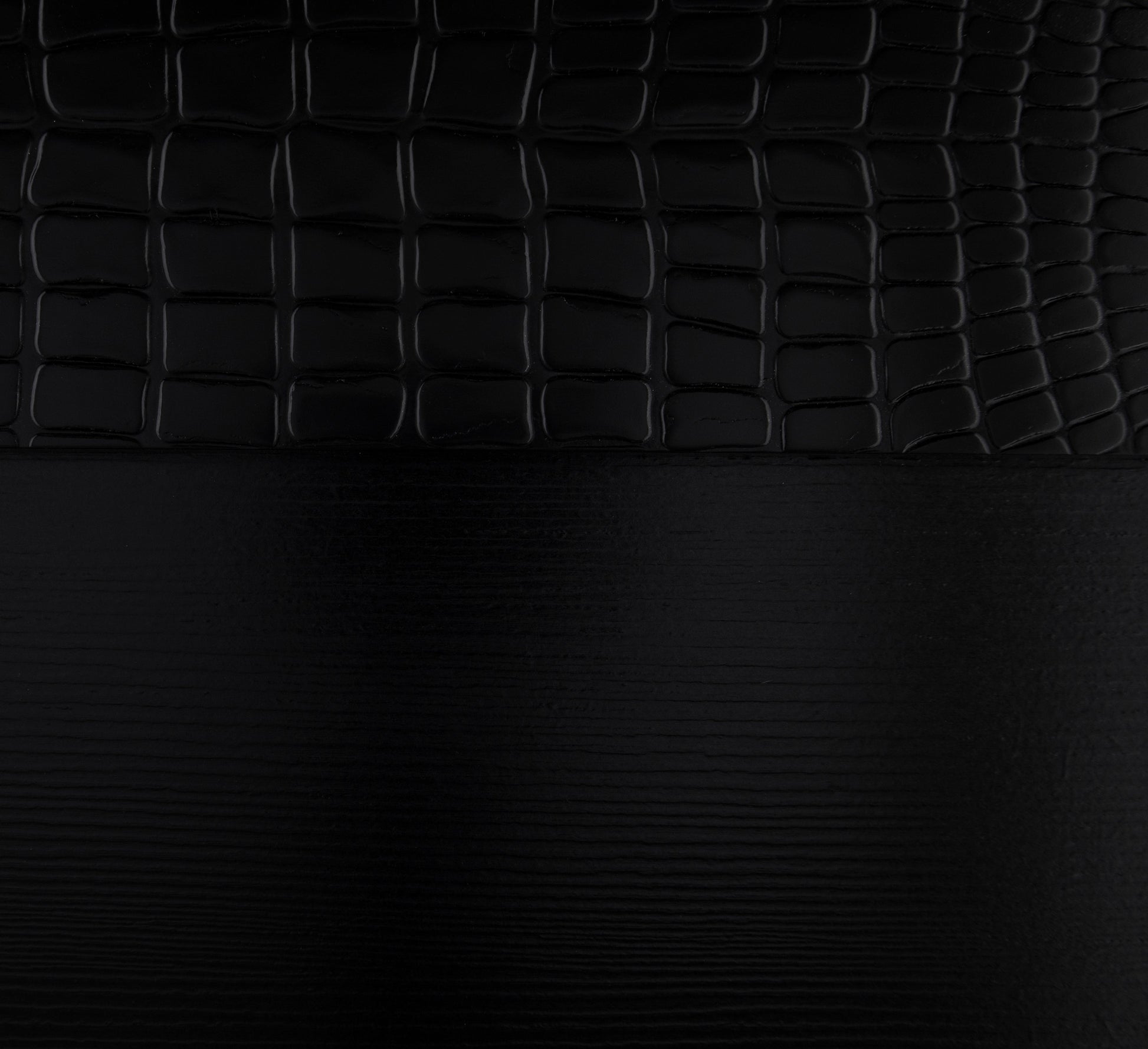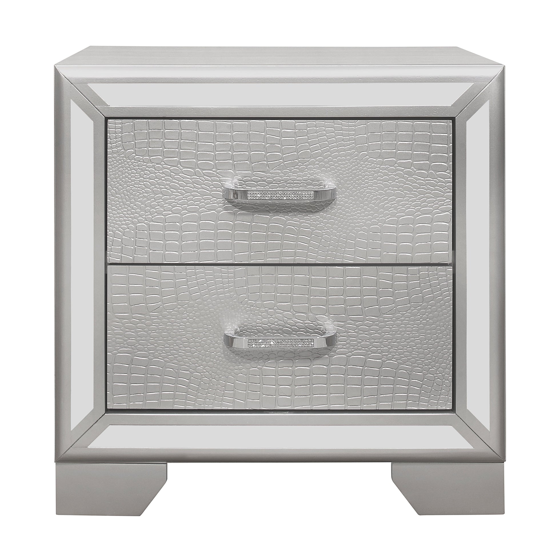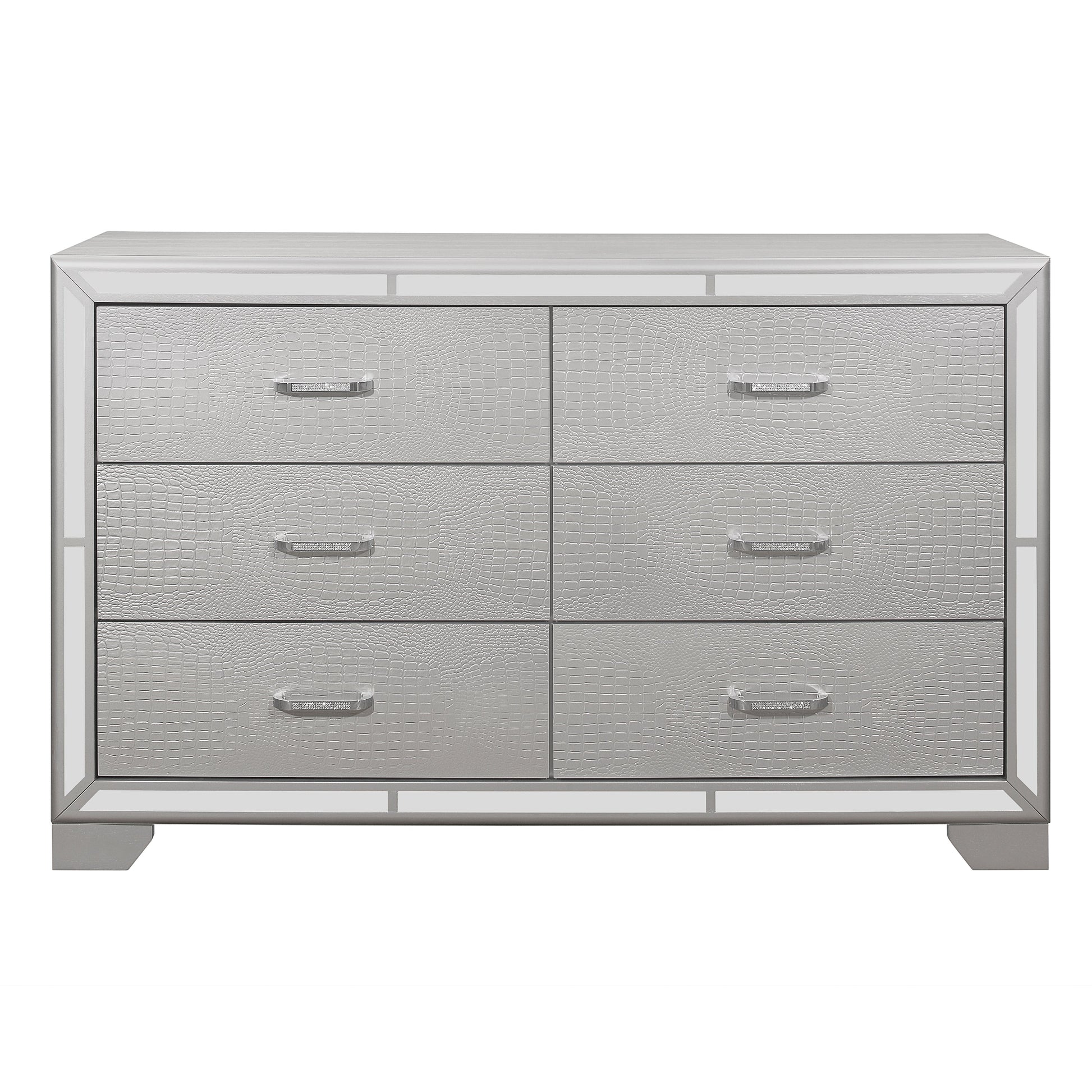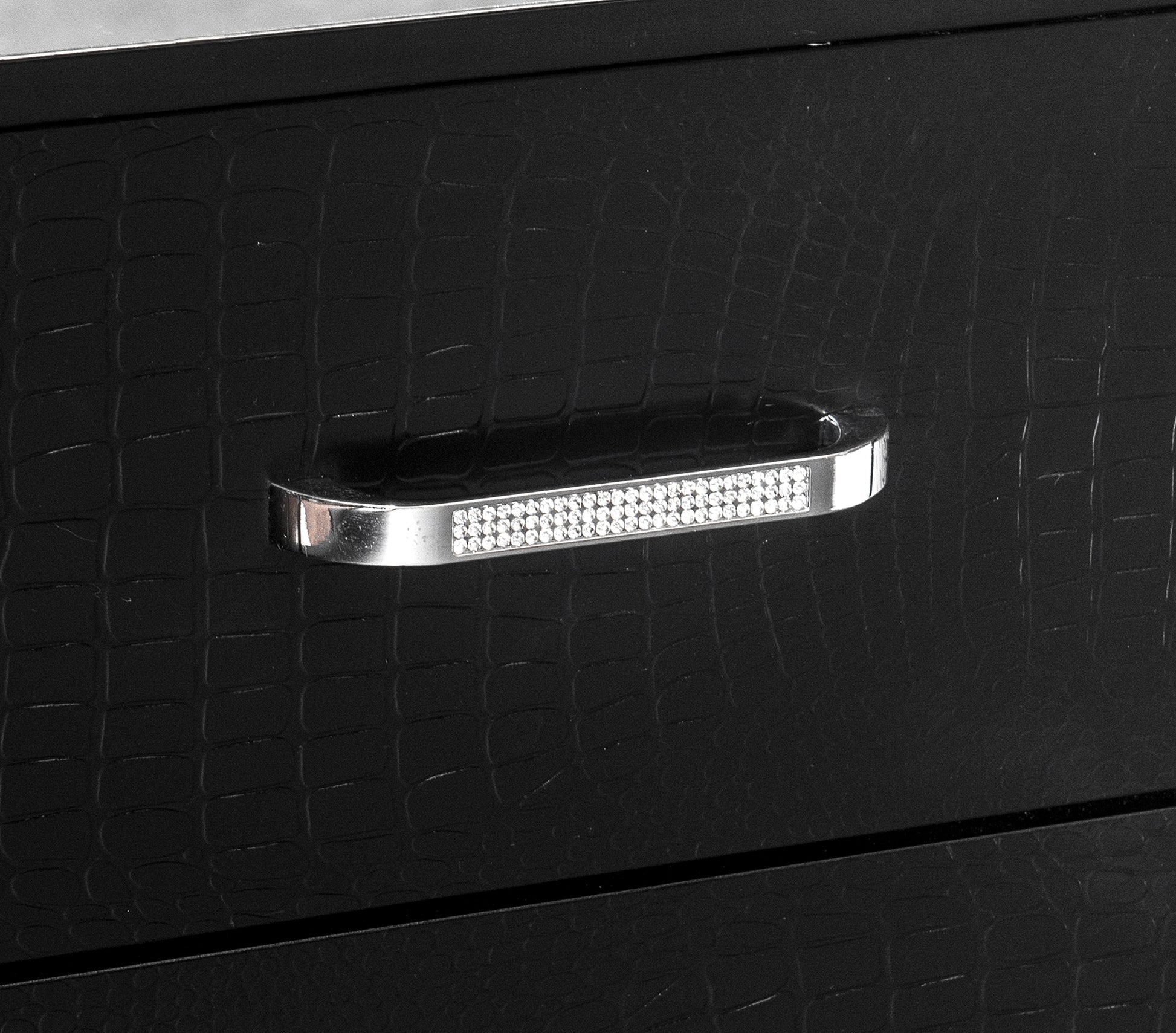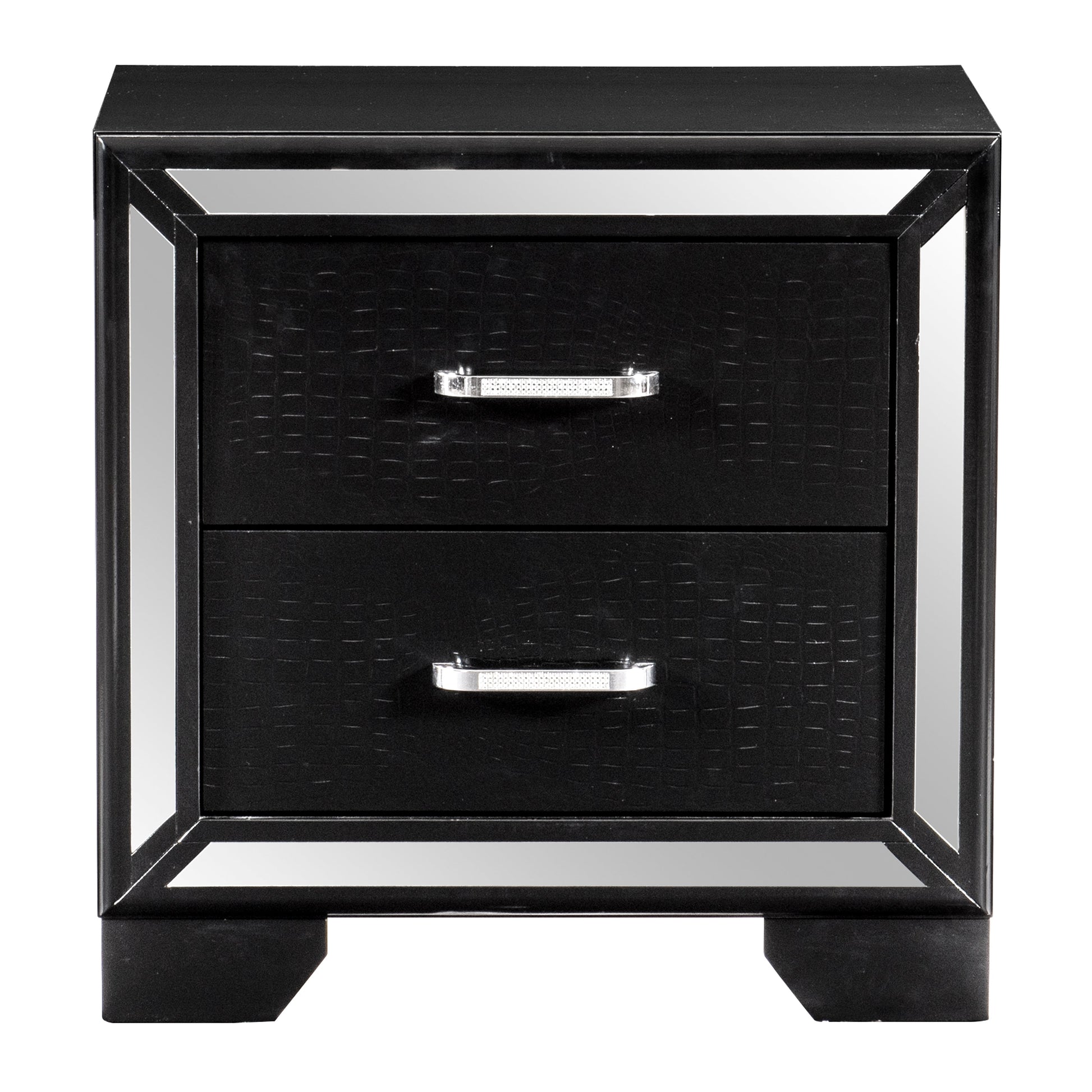 Elegant touches abound with the design of the Aveline Collection. Alligator embossed veneer covers the collection and is finished in black, an elegant palette that beautifully pairs with your bedroom’s accessories and bedding. The headboard is centered with a black faux leather panel that features button tufting and LED backlighting. The queen bed is further accented with mirror trim, reflecting your glamorous style.