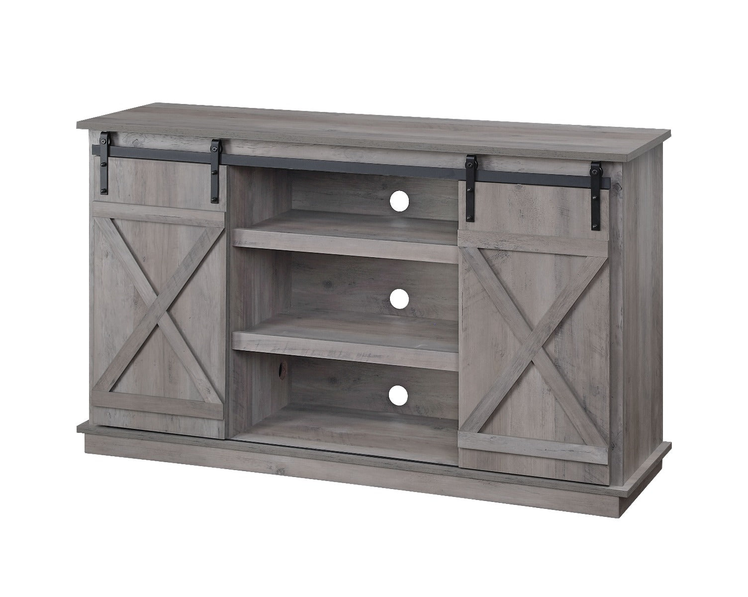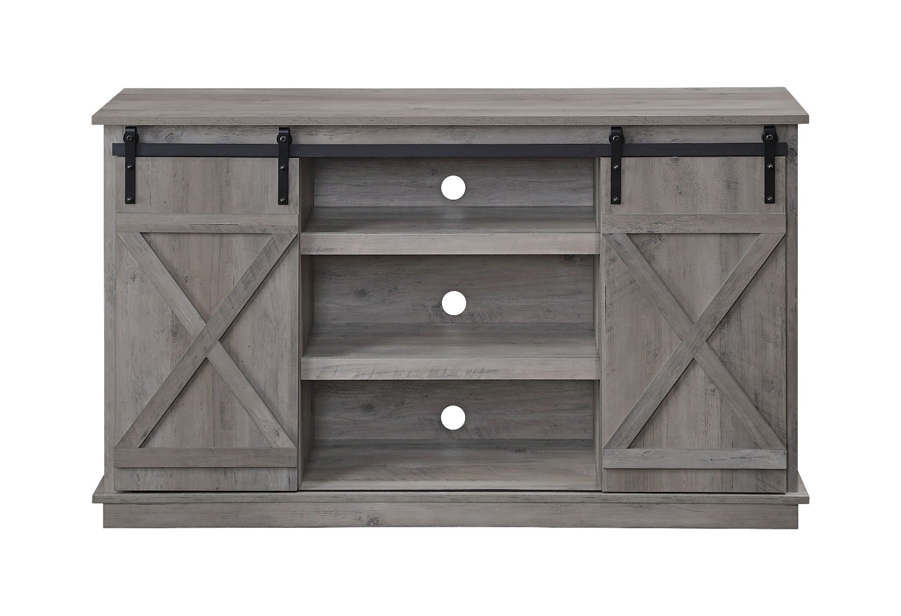 KD Rectangular TV Stand 2 Sliding Barn Doors 1 Tier Shelf Behind Each Door Maximum TV Screen Size Accommodated: 60" 3 Open Compartments Includes Cable Management Hole