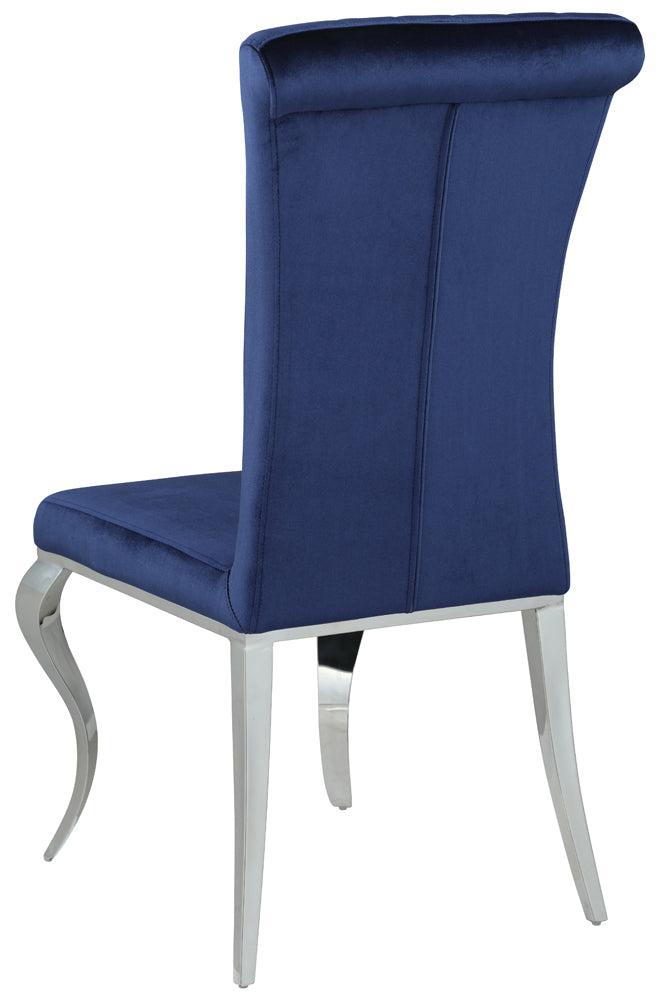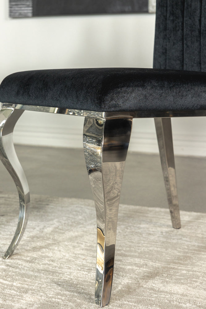 * Sleek upholstered side chairs with plush soft velvet in four colors: black, grey, ink blue and teal. Chairs have vertical channeling and roll back cap rail