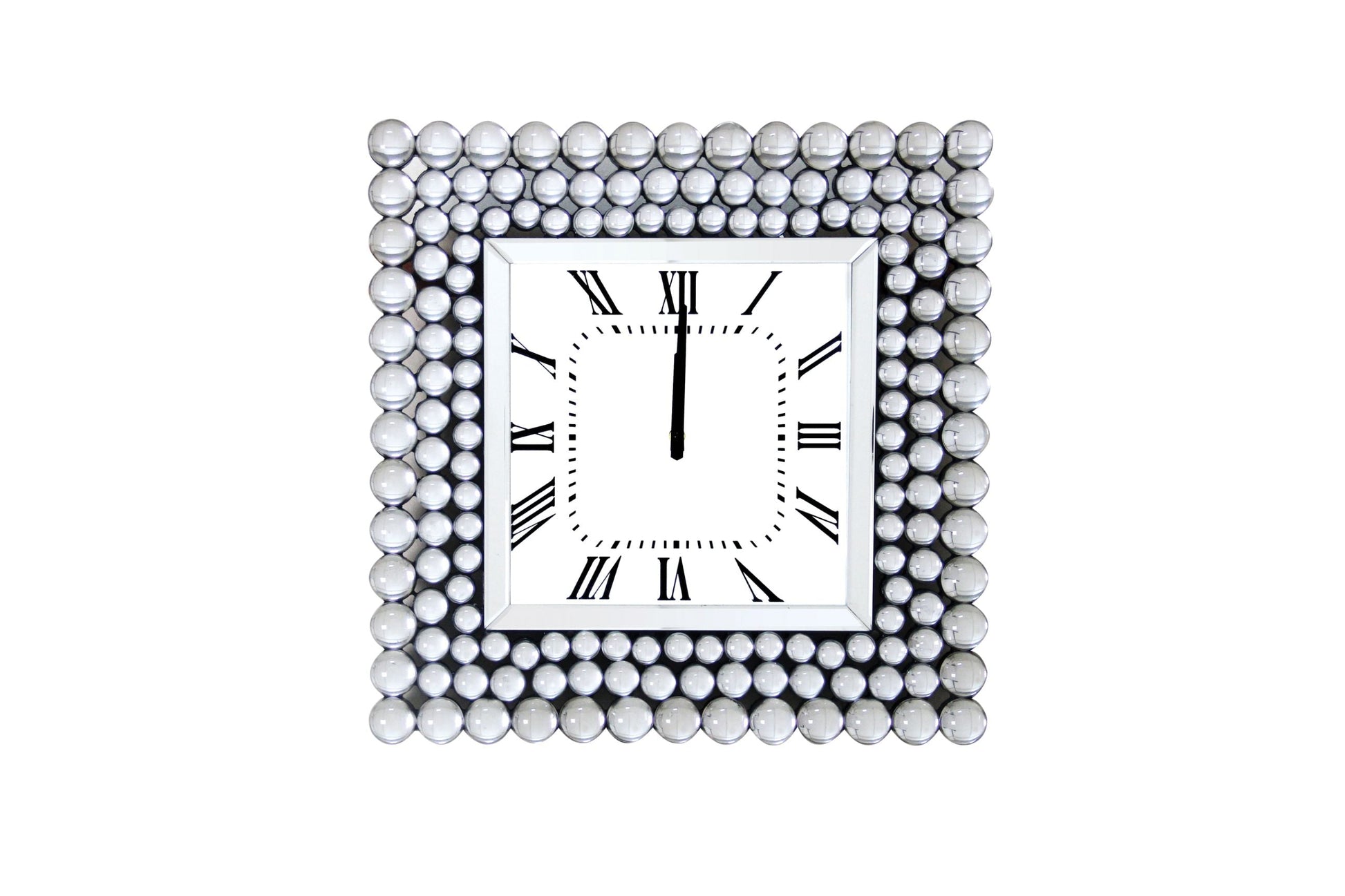 Time to shine with the Bione mirrored wall clock! With shiny jeweled accents around its modern square clock face, this clock lets you add some bling to your home Decor! The clock face has a clean, modern look featuring roman numerals.