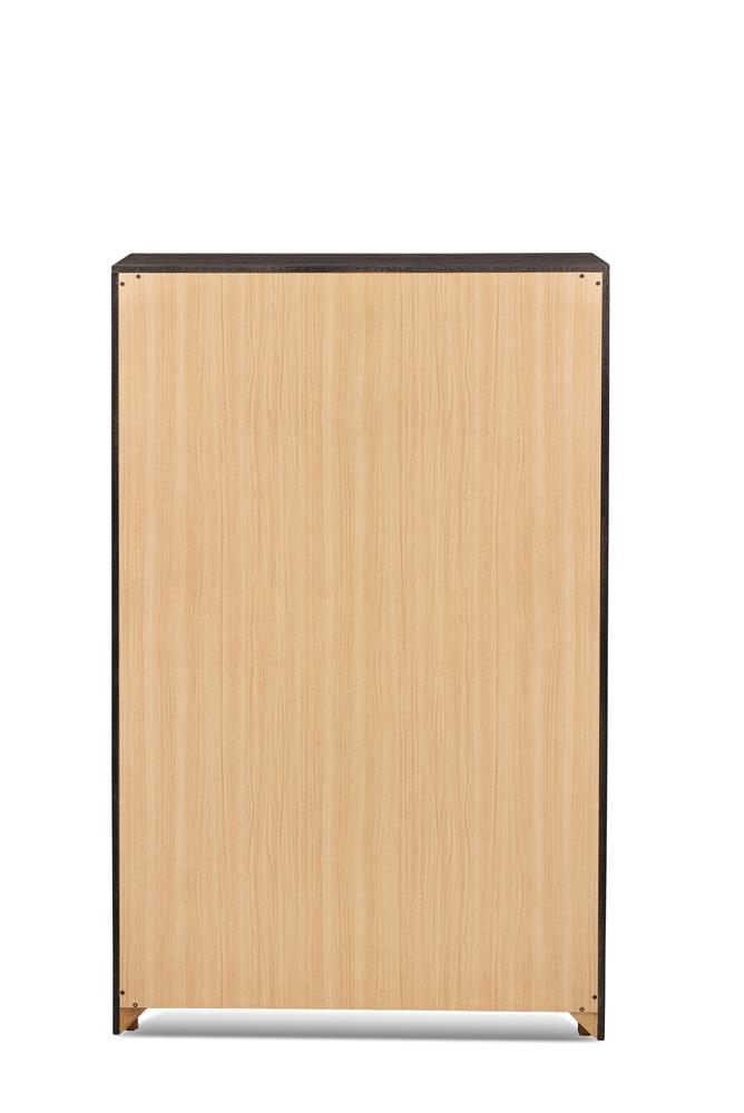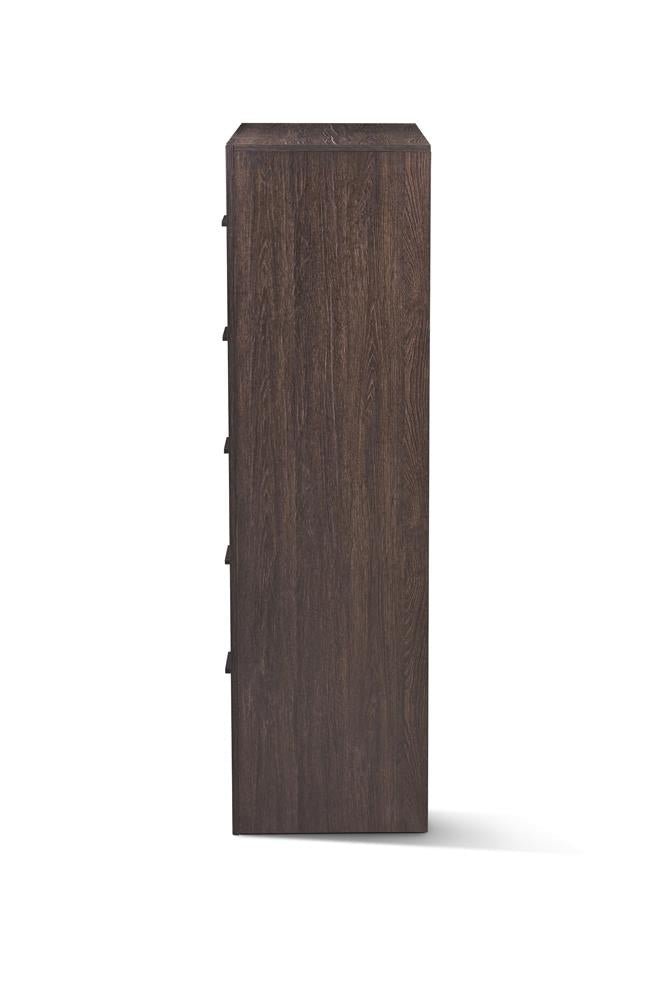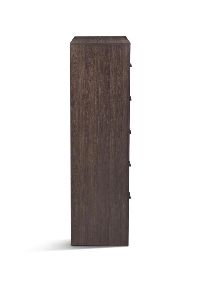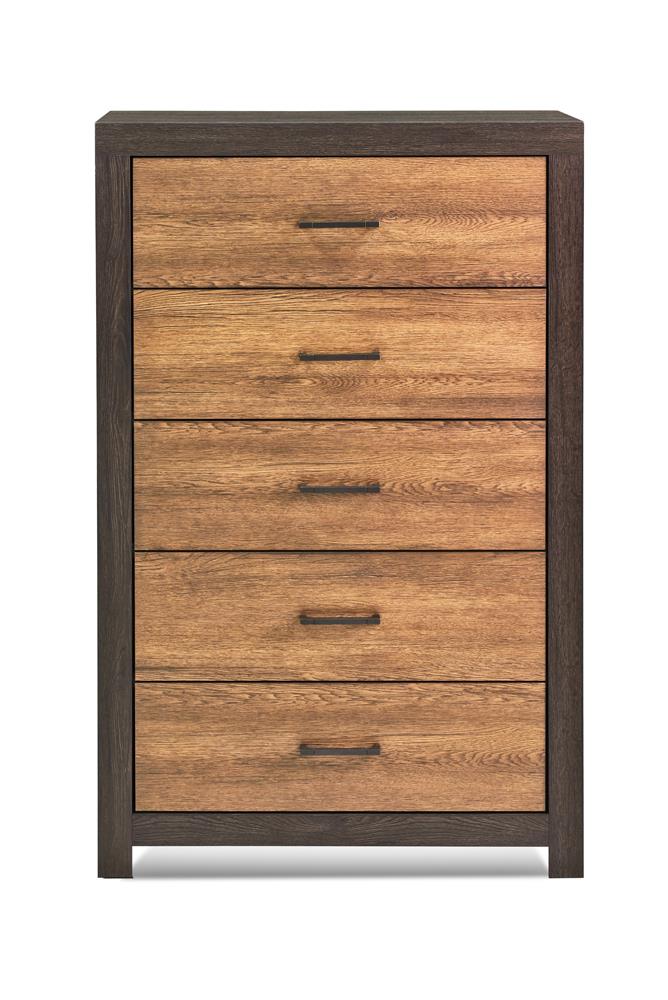 It's love at first sight when you lay eyes on this transitional five-drawer chest with a rustic two-tone design. You'll enjoy the tranquil ambiance cast by its reclaimed wood material construction. The frame has a visually pleasing deep licorice finish that looks great with most decor. The drawers have a caramel finish accented by wood grain details and are adorned with dark bronze metal pull handles that complement the darker tones. It sits perched on solid legs and sides for maximum stability and durability.