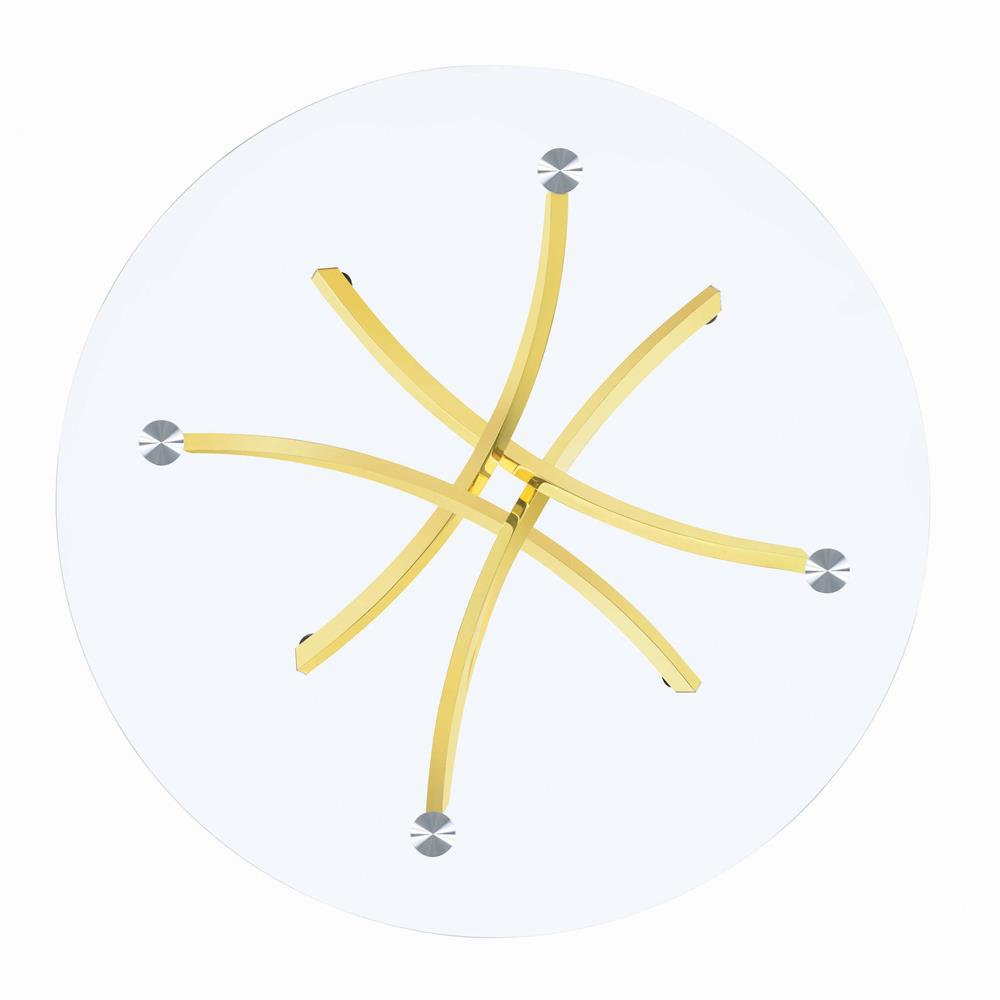 Stay on the edge of contemporary glamour. This dinette table indulges a love of clear glass and embellishes it with a radiant brass finish frame. Artfully designed, its base offers eye-pleasing contoured strips. A round glass top delivers sophistication and elegance. This gorgeous table features floor-protecting discs under each leg.