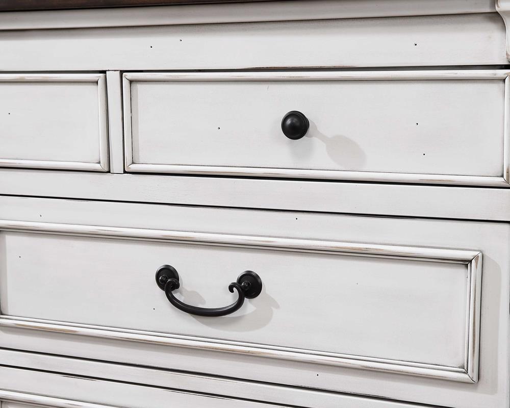 Instantly implement country chic living into your sleeping space with this immaculate nine-drawer dresser. The drawers are crafted on self-closing glides to make it easy to use and even easier to love. Stylish black hardware contrasts beautifully with this white finish. A dark rum tabletop provides plenty of storage space for small decorative items and essentials. This piece is crafted from Asian hardwood and supported on block style feet.